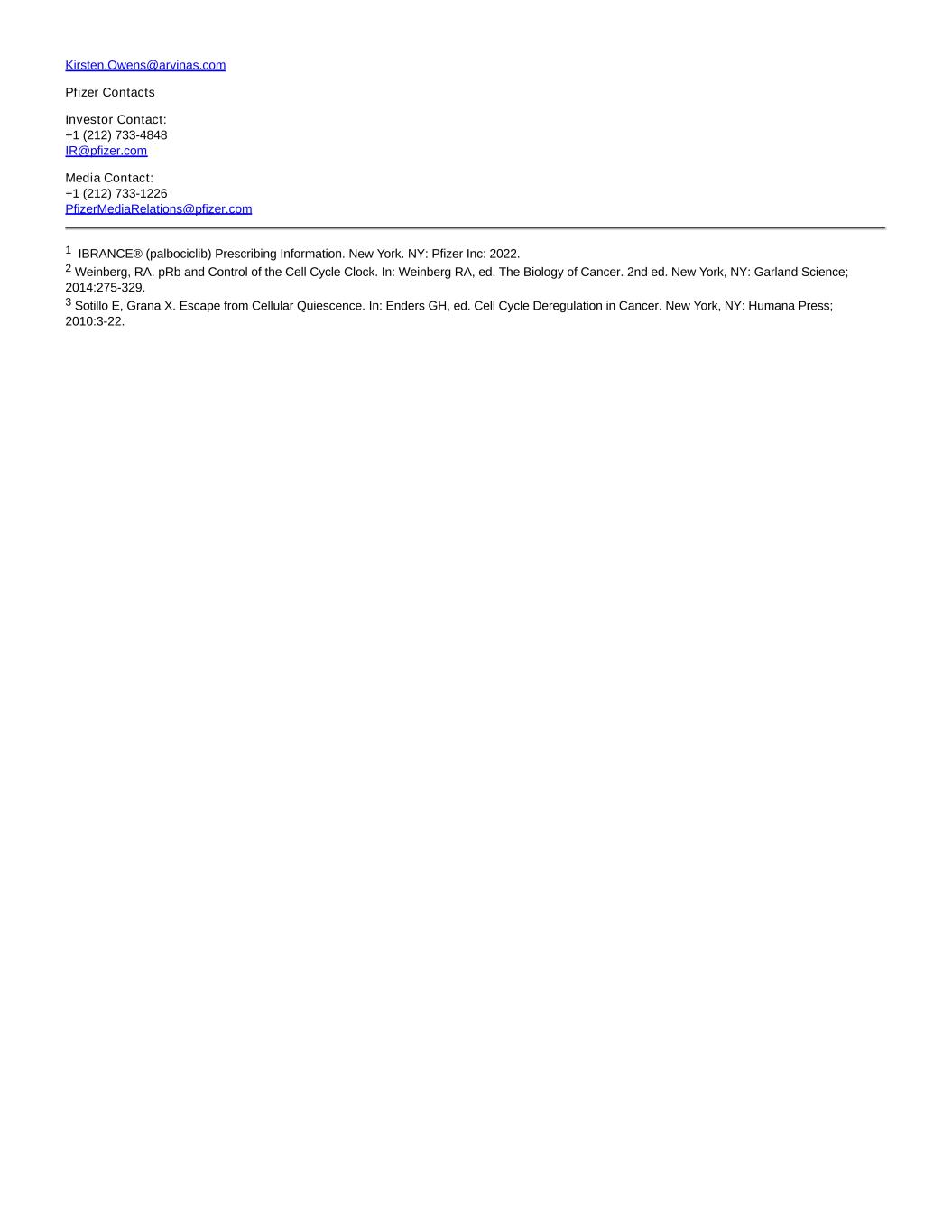 Kirsten.Owens@arvinas.com Pfizer Contacts Investor Contact: +1 (212) 733-4848 IR@pfizer.com Media Contact: +1 (212) 733-1226 PfizerMediaRelations@pfizer.com 1  IBRANCE® (palbociclib) Prescribing Information. New York. NY: Pfizer Inc: 2022. 2 Weinberg, RA. pRb and Control of the Cell Cycle Clock. In: Weinberg RA, ed. The Biology of Cancer. 2nd ed. New York, NY: Garland Science; 2014:275-329. 3 Sotillo E, Grana X. Escape from Cellular Quiescence. In: Enders GH, ed. Cell Cycle Deregulation in Cancer. New York, NY: Humana Press; 2010:3-22.