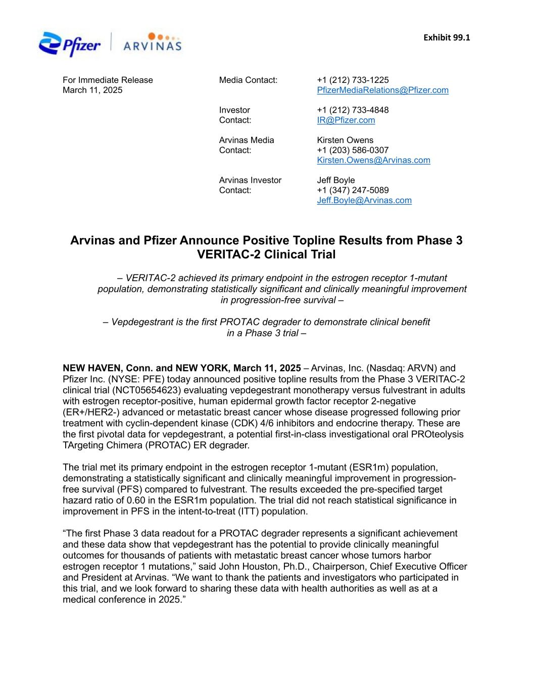 Exhibit 99.1 For Immediate Release March 11, 2025 Media Contact: Investor Contact: +1 (212) 733-1225 PfizerMediaRelations@Pfizer.com +1 (212) 733-4848 IR@Pfizer.com Arvinas Media Contact: Arvinas Investor Contact: Kirsten Owens +1 (203) 586-0307 Kirsten.Owens@Arvinas.com Jeff Boyle +1 (347) 247-5089 Jeff.Boyle@Arvinas.com Arvinas and Pfizer Announce Positive Topline Results from Phase 3 VERITAC-2 Clinical Trial – VERITAC-2 achieved its primary endpoint in the estrogen receptor 1-mutant population, demonstrating statistically significant and clinically meaningful improvement in progression-free survival – – Vepdegestrant is the first PROTAC degrader to demonstrate clinical benefit in a Phase 3 trial – NEW HAVEN, Conn. and NEW YORK, March 11, 2025 – Arvinas, Inc. (Nasdaq: ARVN) and Pfizer Inc. (NYSE: PFE) today announced positive topline results from the Phase 3 VERITAC-2 clinical trial (NCT05654623) evaluating vepdegestrant monotherapy versus fulvestrant in adults with estrogen receptor-positive, human epidermal growth factor receptor 2-negative (ER+/HER2-) advanced or metastatic breast cancer whose disease progressed following prior treatment with cyclin-dependent kinase (CDK) 4/6 inhibitors and endocrine therapy. These are the first pivotal data for vepdegestrant, a potential first-in-class investigational oral PROteolysis TArgeting Chimera (PROTAC) ER degrader. The trial met its primary endpoint in the estrogen receptor 1-mutant (ESR1m) population, demonstrating a statistically significant and clinically meaningful improvement in progression- free survival (PFS) compared to fulvestrant. The results exceeded the pre-specified target hazard ratio of 0.60 in the ESR1m population. The trial did not reach statistical significance in improvement in PFS in the intent-to-treat (ITT) population. “The first Phase 3 data readout for a PROTAC degrader represents a significant achievement and these data show that vepdegestrant has the potential to provide clinically meaningful outcomes for thousands of patients with metastatic breast cancer whose tumors harbor estrogen receptor 1 mutations,” said John Houston, Ph.D., Chairperson, Chief Executive Officer and President at Arvinas. “We want to thank the patients and investigators who participated in this trial, and we look forward to sharing these data with health authorities as well as at a medical conference in 2025.”