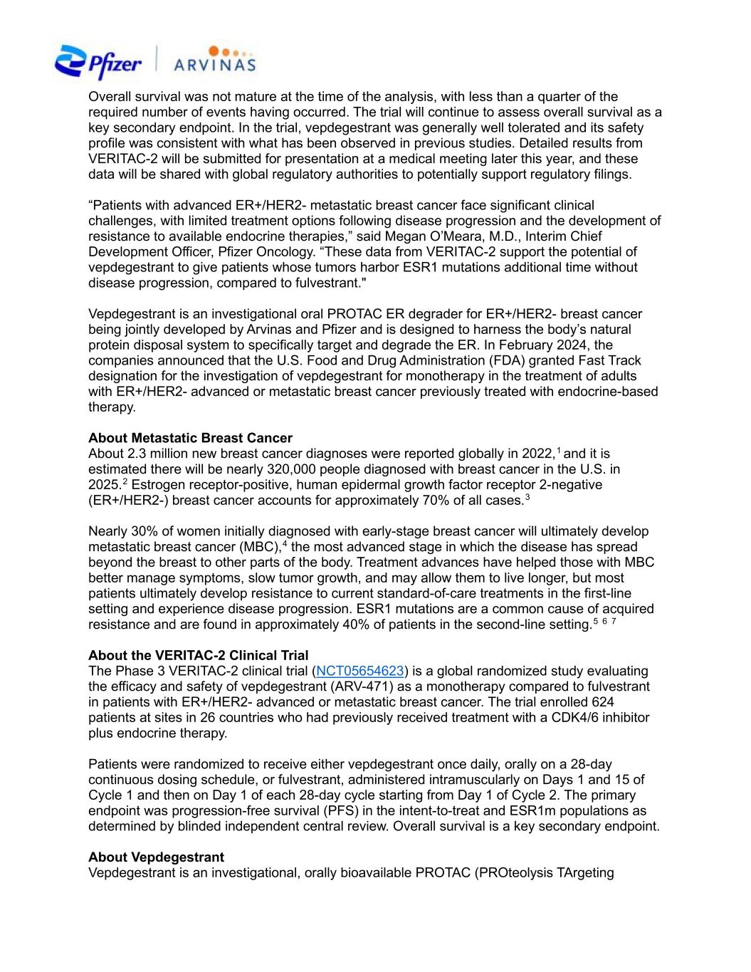 Overall survival was not mature at the time of the analysis, with less than a quarter of the required number of events having occurred. The trial will continue to assess overall survival as a key secondary endpoint. In the trial, vepdegestrant was generally well tolerated and its safety profile was consistent with what has been observed in previous studies. Detailed results from VERITAC-2 will be submitted for presentation at a medical meeting later this year, and these data will be shared with global regulatory authorities to potentially support regulatory filings. “Patients with advanced ER+/HER2- metastatic breast cancer face significant clinical challenges, with limited treatment options following disease progression and the development of resistance to available endocrine therapies,” said Megan O’Meara, M.D., Interim Chief Development Officer, Pfizer Oncology. “These data from VERITAC-2 support the potential of vepdegestrant to give patients whose tumors harbor ESR1 mutations additional time without disease progression, compared to fulvestrant." Vepdegestrant is an investigational oral PROTAC ER degrader for ER+/HER2- breast cancer being jointly developed by Arvinas and Pfizer and is designed to harness the body’s natural protein disposal system to specifically target and degrade the ER. In February 2024, the companies announced that the U.S. Food and Drug Administration (FDA) granted Fast Track designation for the investigation of vepdegestrant for monotherapy in the treatment of adults with ER+/HER2- advanced or metastatic breast cancer previously treated with endocrine-based therapy. About Metastatic Breast Cancer About 2.3 million new breast cancer diagnoses were reported globally in 2022,1 and it is estimated there will be nearly 320,000 people diagnosed with breast cancer in the U.S. in 2025.2 Estrogen receptor-positive, human epidermal growth factor receptor 2-negative (ER+/HER2-) breast cancer accounts for approximately 70% of all cases.3 Nearly 30% of women initially diagnosed with early-stage breast cancer will ultimately develop metastatic breast cancer (MBC),4 the most advanced stage in which the disease has spread beyond the breast to other parts of the body. Treatment advances have helped those with MBC better manage symptoms, slow tumor growth, and may allow them to live longer, but most patients ultimately develop resistance to current standard-of-care treatments in the first-line setting and experience disease progression. ESR1 mutations are a common cause of acquired resistance and are found in approximately 40% of patients in the second-line setting.5 6 7 About the VERITAC-2 Clinical Trial The Phase 3 VERITAC-2 clinical trial (NCT05654623) is a global randomized study evaluating the efficacy and safety of vepdegestrant (ARV-471) as a monotherapy compared to fulvestrant in patients with ER+/HER2- advanced or metastatic breast cancer. The trial enrolled 624 patients at sites in 26 countries who had previously received treatment with a CDK4/6 inhibitor plus endocrine therapy. Patients were randomized to receive either vepdegestrant once daily, orally on a 28-day continuous dosing schedule, or fulvestrant, administered intramuscularly on Days 1 and 15 of Cycle 1 and then on Day 1 of each 28-day cycle starting from Day 1 of Cycle 2. The primary endpoint was progression-free survival (PFS) in the intent-to-treat and ESR1m populations as determined by blinded independent central review. Overall survival is a key secondary endpoint. About Vepdegestrant Vepdegestrant is an investigational, orally bioavailable PROTAC (PROteolysis TArgeting