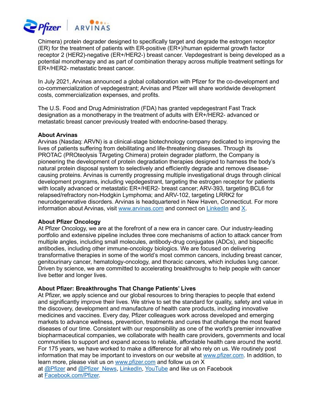 Chimera) protein degrader designed to specifically target and degrade the estrogen receptor (ER) for the treatment of patients with ER-positive (ER+)/human epidermal growth factor receptor 2 (HER2)-negative (ER+/HER2-) breast cancer. Vepdegestrant is being developed as a potential monotherapy and as part of combination therapy across multiple treatment settings for ER+/HER2- metastatic breast cancer. In July 2021, Arvinas announced a global collaboration with Pfizer for the co-development and co-commercialization of vepdegestrant; Arvinas and Pfizer will share worldwide development costs, commercialization expenses, and profits. The U.S. Food and Drug Administration (FDA) has granted vepdegestrant Fast Track designation as a monotherapy in the treatment of adults with ER+/HER2- advanced or metastatic breast cancer previously treated with endocrine-based therapy. About Arvinas Arvinas (Nasdaq: ARVN) is a clinical-stage biotechnology company dedicated to improving the lives of patients suffering from debilitating and life-threatening diseases. Through its PROTAC (PROteolysis TArgeting Chimera) protein degrader platform, the Company is pioneering the development of protein degradation therapies designed to harness the body’s natural protein disposal system to selectively and efficiently degrade and remove disease- causing proteins. Arvinas is currently progressing multiple investigational drugs through clinical development programs, including vepdegestrant, targeting the estrogen receptor for patients with locally advanced or metastatic ER+/HER2- breast cancer; ARV-393, targeting BCL6 for relapsed/refractory non-Hodgkin Lymphoma; and ARV-102, targeting LRRK2 for neurodegenerative disorders. Arvinas is headquartered in New Haven, Connecticut. For more information about Arvinas, visit www.arvinas.com and connect on LinkedIn and X. About Pfizer Oncology At Pfizer Oncology, we are at the forefront of a new era in cancer care. Our industry-leading portfolio and extensive pipeline includes three core mechanisms of action to attack cancer from multiple angles, including small molecules, antibody-drug conjugates (ADCs), and bispecific antibodies, including other immune-oncology biologics. We are focused on delivering transformative therapies in some of the world’s most common cancers, including breast cancer, genitourinary cancer, hematology-oncology, and thoracic cancers, which includes lung cancer. Driven by science, we are committed to accelerating breakthroughs to help people with cancer live better and longer lives. About Pfizer: Breakthroughs That Change Patients’ Lives At Pfizer, we apply science and our global resources to bring therapies to people that extend and significantly improve their lives. We strive to set the standard for quality, safety and value in the discovery, development and manufacture of health care products, including innovative medicines and vaccines. Every day, Pfizer colleagues work across developed and emerging markets to advance wellness, prevention, treatments and cures that challenge the most feared diseases of our time. Consistent with our responsibility as one of the world's premier innovative biopharmaceutical companies, we collaborate with health care providers, governments and local communities to support and expand access to reliable, affordable health care around the world. For 175 years, we have worked to make a difference for all who rely on us. We routinely post information that may be important to investors on our website at www.pfizer.com. In addition, to learn more, please visit us on www.pfizer.com and follow us on X at @Pfizer and @Pfizer_News, LinkedIn, YouTube and like us on Facebook at Facebook.com/Pfizer.