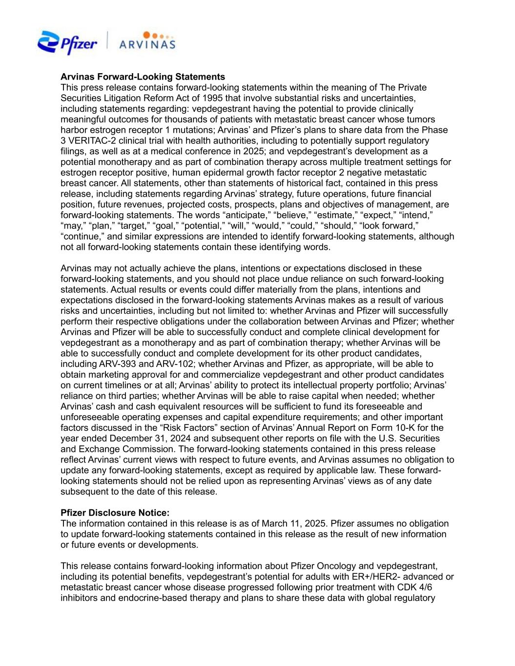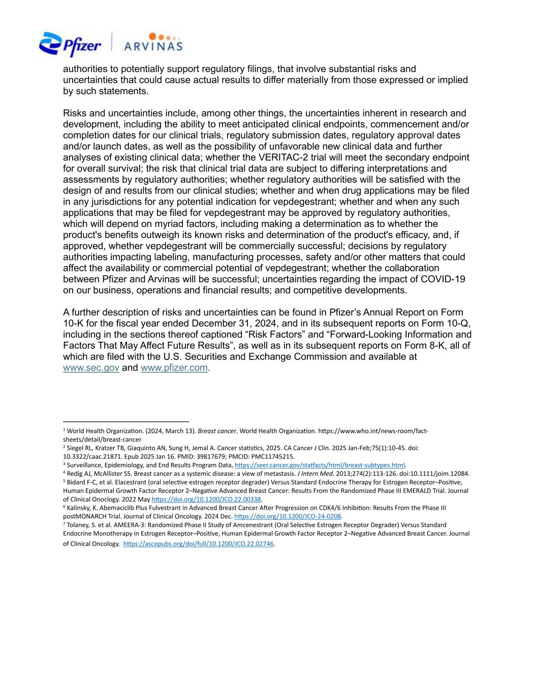 authorities to potentially support regulatory filings, that involve substantial risks and uncertainties that could cause actual results to differ materially from those expressed or implied by such statements. Risks and uncertainties include, among other things, the uncertainties inherent in research and development, including the ability to meet anticipated clinical endpoints, commencement and/or completion dates for our clinical trials, regulatory submission dates, regulatory approval dates and/or launch dates, as well as the possibility of unfavorable new clinical data and further analyses of existing clinical data; whether the VERITAC-2 trial will meet the secondary endpoint for overall survival; the risk that clinical trial data are subject to differing interpretations and assessments by regulatory authorities; whether regulatory authorities will be satisfied with the design of and results from our clinical studies; whether and when drug applications may be filed in any jurisdictions for any potential indication for vepdegestrant; whether and when any such applications that may be filed for vepdegestrant may be approved by regulatory authorities, which will depend on myriad factors, including making a determination as to whether the product's benefits outweigh its known risks and determination of the product's efficacy, and, if approved, whether vepdegestrant will be commercially successful; decisions by regulatory authorities impacting labeling, manufacturing processes, safety and/or other matters that could affect the availability or commercial potential of vepdegestrant; whether the collaboration between Pfizer and Arvinas will be successful; uncertainties regarding the impact of COVID-19 on our business, operations and financial results; and competitive developments. A further description of risks and uncertainties can be found in Pfizer’s Annual Report on Form 10-K for the fiscal year ended December 31, 2024, and in its subsequent reports on Form 10-Q, including in the sections thereof captioned “Risk Factors” and “Forward-Looking Information and Factors That May Affect Future Results”, as well as in its subsequent reports on Form 8-K, all of which are filed with the U.S. Securities and Exchange Commission and available at www.sec.gov and www.pfizer.com. 1 World Health Organization. (2024, March 13). Breast cancer. World Health Organization. https://www.who.int/news-room/fact- sheets/detail/breast-cancer 2 Siegel RL, Kratzer TB, Giaquinto AN, Sung H, Jemal A. Cancer statistics, 2025. CA Cancer J Clin. 2025 Jan-Feb;75(1):10-45. doi: 10.3322/caac.21871. Epub 2025 Jan 16. PMID: 39817679; PMCID: PMC11745215. 3 Surveillance, Epidemiology, and End Results Program Data, https://seer.cancer.gov/statfacts/html/breast-subtypes.html. 4 Redig AJ, McAllister SS. Breast cancer as a systemic disease: a view of metastasis. J Intern Med. 2013;274(2):113-126. doi:10.1111/joim.12084. 5 Bidard F-C, et al. Elacestrant (oral selective estrogen receptor degrader) Versus Standard Endocrine Therapy for Estrogen Receptor–Positive, Human Epidermal Growth Factor Receptor 2–Negative Advanced Breast Cancer: Results From the Randomized Phase III EMERALD Trial. Journal of Clinical Onoclogy. 2022 May https://doi.org/10.1200/JCO.22.00338. 6 Kalinsky, K. Abemaciclib Plus Fulvestrant in Advanced Breast Cancer After Progression on CDK4/6 Inhibition: Results From the Phase III postMONARCH Trial. Journal of Clinical Oncology. 2024 Dec. https://doi.org/10.1200/JCO-24-0208. 7 Tolaney, S. et al. AMEERA-3: Randomized Phase II Study of Amcenestrant (Oral Selective Estrogen Receptor Degrader) Versus Standard Endocrine Monotherapy in Estrogen Receptor–Positive, Human Epidermal Growth Factor Receptor 2–Negative Advanced Breast Cancer. Journal of Clinical Oncology. https://ascopubs.org/doi/full/10.1200/JCO.22.02746.