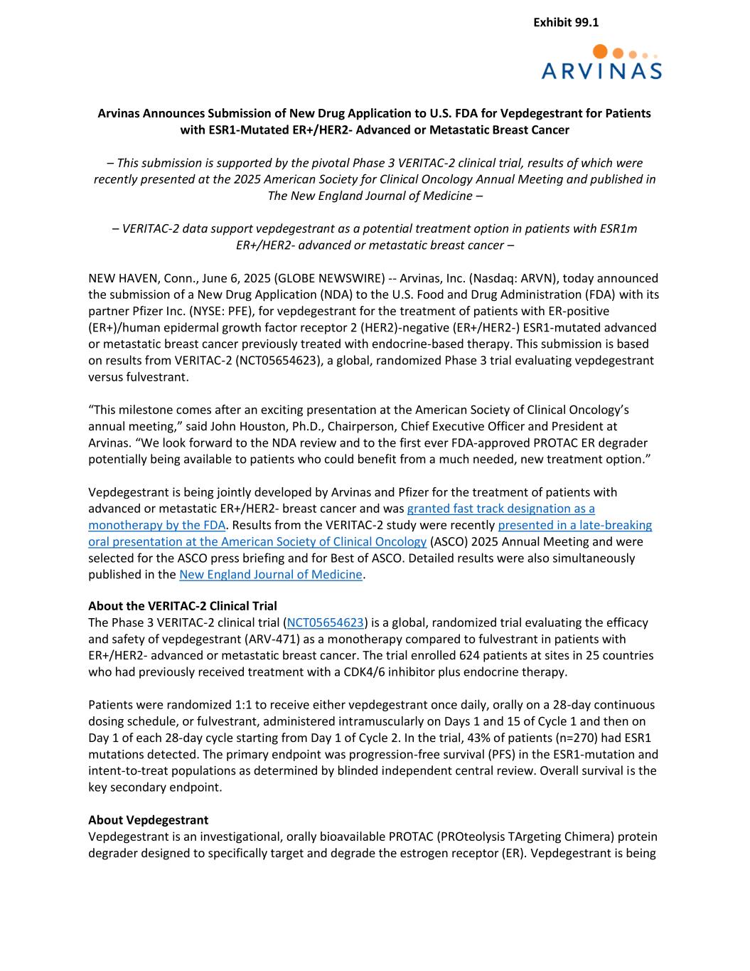 Arvinas Announces Submission of New Drug Application to U.S. FDA for Vepdegestrant for Patients with ESR1-Mutated ER+/HER2- Advanced or Metastatic Breast Cancer – This submission is supported by the pivotal Phase 3 VERITAC-2 clinical trial, results of which were recently presented at the 2025 American Society for Clinical Oncology Annual Meeting and published in The New England Journal of Medicine – – VERITAC-2 data support vepdegestrant as a potential treatment option in patients with ESR1m ER+/HER2- advanced or metastatic breast cancer – NEW HAVEN, Conn., June 6, 2025 (GLOBE NEWSWIRE) -- Arvinas, Inc. (Nasdaq: ARVN), today announced the submission of a New Drug Application (NDA) to the U.S. Food and Drug Administration (FDA) with its partner Pfizer Inc. (NYSE: PFE), for vepdegestrant for the treatment of patients with ER-positive (ER+)/human epidermal growth factor receptor 2 (HER2)-negative (ER+/HER2-) ESR1-mutated advanced or metastatic breast cancer previously treated with endocrine-based therapy. This submission is based on results from VERITAC-2 (NCT05654623), a global, randomized Phase 3 trial evaluating vepdegestrant versus fulvestrant. “This milestone comes after an exciting presentation at the American Society of Clinical Oncology’s annual meeting,” said John Houston, Ph.D., Chairperson, Chief Executive Officer and President at Arvinas. “We look forward to the NDA review and to the first ever FDA-approved PROTAC ER degrader potentially being available to patients who could benefit from a much needed, new treatment option.” Vepdegestrant is being jointly developed by Arvinas and Pfizer for the treatment of patients with advanced or metastatic ER+/HER2- breast cancer and was granted fast track designation as a monotherapy by the FDA. Results from the VERITAC-2 study were recently presented in a late-breaking oral presentation at the American Society of Clinical Oncology (ASCO) 2025 Annual Meeting and were selected for the ASCO press briefing and for Best of ASCO. Detailed results were also simultaneously published in the New England Journal of Medicine. About the VERITAC-2 Clinical Trial The Phase 3 VERITAC-2 clinical trial (NCT05654623) is a global, randomized trial evaluating the efficacy and safety of vepdegestrant (ARV-471) as a monotherapy compared to fulvestrant in patients with ER+/HER2- advanced or metastatic breast cancer. The trial enrolled 624 patients at sites in 25 countries who had previously received treatment with a CDK4/6 inhibitor plus endocrine therapy. Patients were randomized 1:1 to receive either vepdegestrant once daily, orally on a 28-day continuous dosing schedule, or fulvestrant, administered intramuscularly on Days 1 and 15 of Cycle 1 and then on Day 1 of each 28-day cycle starting from Day 1 of Cycle 2. In the trial, 43% of patients (n=270) had ESR1 mutations detected. The primary endpoint was progression-free survival (PFS) in the ESR1-mutation and intent-to-treat populations as determined by blinded independent central review. Overall survival is the key secondary endpoint. About Vepdegestrant Vepdegestrant is an investigational, orally bioavailable PROTAC (PROteolysis TArgeting Chimera) protein degrader designed to specifically target and degrade the estrogen receptor (ER). Vepdegestrant is being Exhibit 99.1