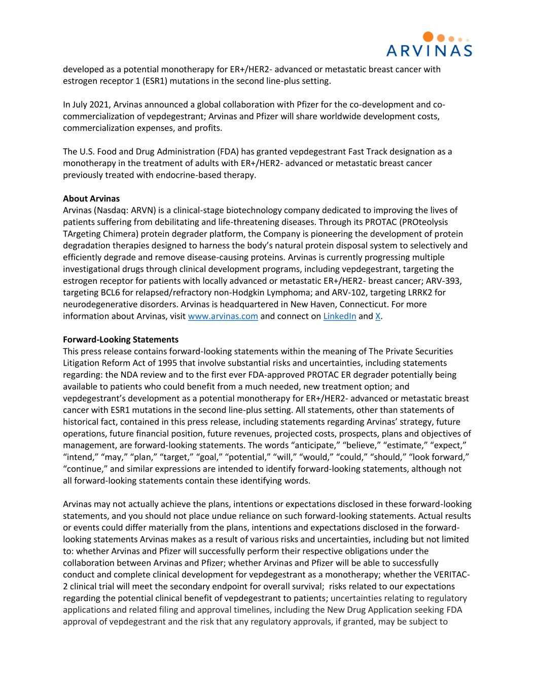 developed as a potential monotherapy for ER+/HER2- advanced or metastatic breast cancer with estrogen receptor 1 (ESR1) mutations in the second line-plus setting. In July 2021, Arvinas announced a global collaboration with Pfizer for the co-development and co- commercialization of vepdegestrant; Arvinas and Pfizer will share worldwide development costs, commercialization expenses, and profits. The U.S. Food and Drug Administration (FDA) has granted vepdegestrant Fast Track designation as a monotherapy in the treatment of adults with ER+/HER2- advanced or metastatic breast cancer previously treated with endocrine-based therapy. About Arvinas Arvinas (Nasdaq: ARVN) is a clinical-stage biotechnology company dedicated to improving the lives of patients suffering from debilitating and life-threatening diseases. Through its PROTAC (PROteolysis TArgeting Chimera) protein degrader platform, the Company is pioneering the development of protein degradation therapies designed to harness the body’s natural protein disposal system to selectively and efficiently degrade and remove disease-causing proteins. Arvinas is currently progressing multiple investigational drugs through clinical development programs, including vepdegestrant, targeting the estrogen receptor for patients with locally advanced or metastatic ER+/HER2- breast cancer; ARV-393, targeting BCL6 for relapsed/refractory non-Hodgkin Lymphoma; and ARV-102, targeting LRRK2 for neurodegenerative disorders. Arvinas is headquartered in New Haven, Connecticut. For more information about Arvinas, visit www.arvinas.com and connect on LinkedIn and X. Forward-Looking Statements This press release contains forward-looking statements within the meaning of The Private Securities Litigation Reform Act of 1995 that involve substantial risks and uncertainties, including statements regarding: the NDA review and to the first ever FDA-approved PROTAC ER degrader potentially being available to patients who could benefit from a much needed, new treatment option; and vepdegestrant’s development as a potential monotherapy for ER+/HER2- advanced or metastatic breast cancer with ESR1 mutations in the second line-plus setting. All statements, other than statements of historical fact, contained in this press release, including statements regarding Arvinas’ strategy, future operations, future financial position, future revenues, projected costs, prospects, plans and objectives of management, are forward-looking statements. The words “anticipate,” “believe,” “estimate,” “expect,” “intend,” “may,” “plan,” “target,” “goal,” “potential,” “will,” “would,” “could,” “should,” “look forward,” “continue,” and similar expressions are intended to identify forward-looking statements, although not all forward-looking statements contain these identifying words. Arvinas may not actually achieve the plans, intentions or expectations disclosed in these forward-looking statements, and you should not place undue reliance on such forward-looking statements. Actual results or events could differ materially from the plans, intentions and expectations disclosed in the forward- looking statements Arvinas makes as a result of various risks and uncertainties, including but not limited to: whether Arvinas and Pfizer will successfully perform their respective obligations under the collaboration between Arvinas and Pfizer; whether Arvinas and Pfizer will be able to successfully conduct and complete clinical development for vepdegestrant as a monotherapy; whether the VERITAC- 2 clinical trial will meet the secondary endpoint for overall survival; risks related to our expectations regarding the potential clinical benefit of vepdegestrant to patients; uncertainties relating to regulatory applications and related filing and approval timelines, including the New Drug Application seeking FDA approval of vepdegestrant and the risk that any regulatory approvals, if granted, may be subject to
