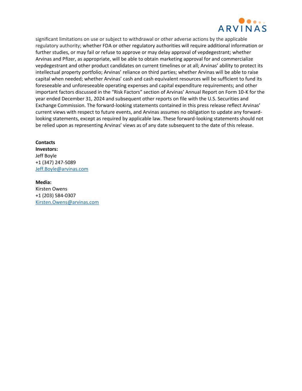 significant limitations on use or subject to withdrawal or other adverse actions by the applicable regulatory authority; whether FDA or other regulatory authorities will require additional information or further studies, or may fail or refuse to approve or may delay approval of vepdegestrant; whether Arvinas and Pfizer, as appropriate, will be able to obtain marketing approval for and commercialize vepdegestrant and other product candidates on current timelines or at all; Arvinas’ ability to protect its intellectual property portfolio; Arvinas’ reliance on third parties; whether Arvinas will be able to raise capital when needed; whether Arvinas’ cash and cash equivalent resources will be sufficient to fund its foreseeable and unforeseeable operating expenses and capital expenditure requirements; and other important factors discussed in the “Risk Factors” section of Arvinas’ Annual Report on Form 10-K for the year ended December 31, 2024 and subsequent other reports on file with the U.S. Securities and Exchange Commission. The forward-looking statements contained in this press release reflect Arvinas’ current views with respect to future events, and Arvinas assumes no obligation to update any forward- looking statements, except as required by applicable law. These forward-looking statements should not be relied upon as representing Arvinas’ views as of any date subsequent to the date of this release. Contacts Investors: Jeff Boyle +1 (347) 247-5089 Jeff.Boyle@arvinas.com Media: Kirsten Owens +1 (203) 584-0307 Kirsten.Owens@arvinas.com