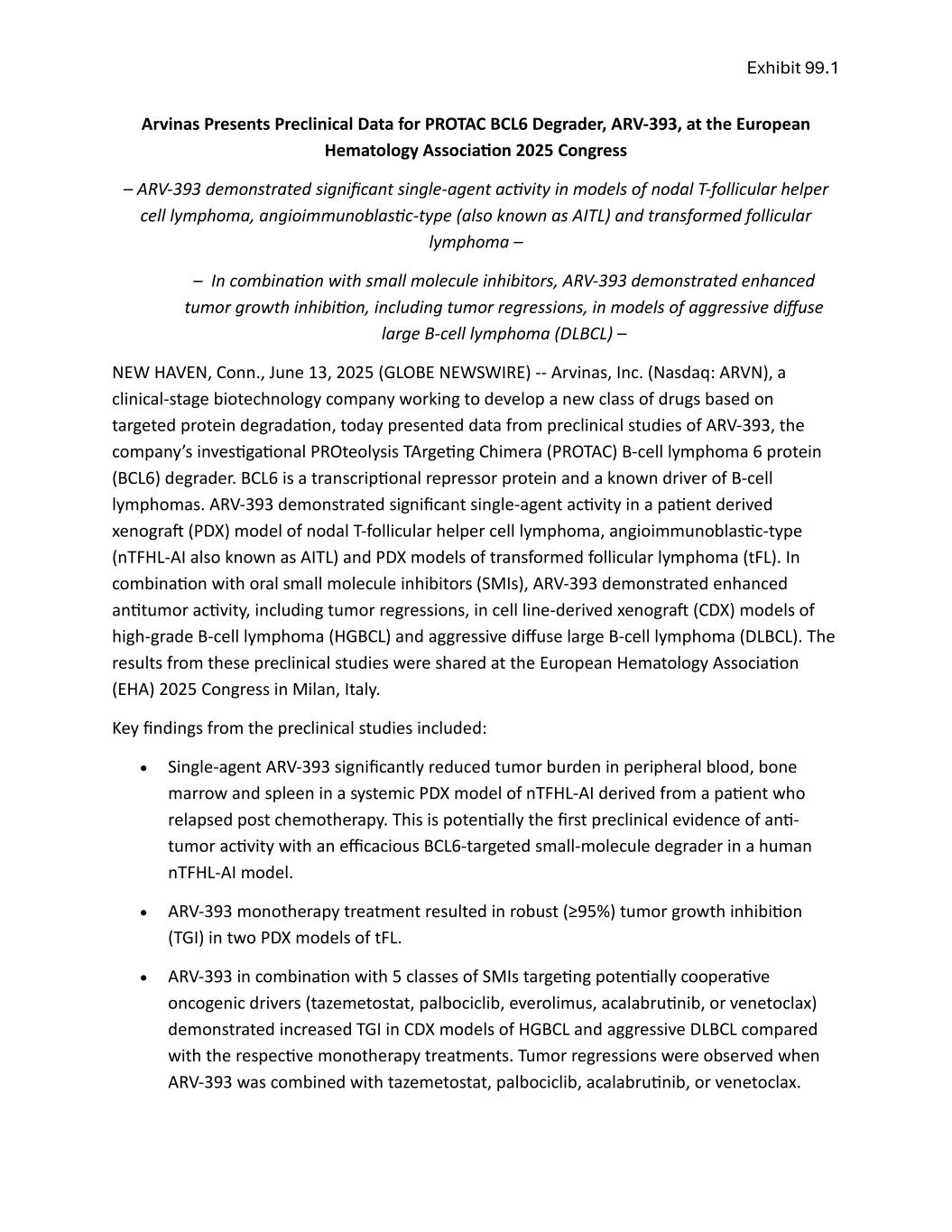 Exhibit 99.1 Arvinas Presents Preclinical Data for PROTAC BCL6 Degrader, ARV-393, at the European Hematology Association 2025 Congress – ARV-393 demonstrated significant single-agent activity in models of nodal T-follicular helper cell lymphoma, angioimmunoblastic-type (also known as AITL) and transformed follicular lymphoma – – In combination with small molecule inhibitors, ARV-393 demonstrated enhanced tumor growth inhibition, including tumor regressions, in models of aggressive diffuse large B-cell lymphoma (DLBCL) – NEW HAVEN, Conn., June 13, 2025 (GLOBE NEWSWIRE) -- Arvinas, Inc. (Nasdaq: ARVN), a clinical-stage biotechnology company working to develop a new class of drugs based on targeted protein degradation, today presented data from preclinical studies of ARV-393, the company’s investigational PROteolysis TArgeting Chimera (PROTAC) B-cell lymphoma 6 protein (BCL6) degrader. BCL6 is a transcriptional repressor protein and a known driver of B-cell lymphomas. ARV-393 demonstrated significant single-agent activity in a patient derived xenograft (PDX) model of nodal T-follicular helper cell lymphoma, angioimmunoblastic-type (nTFHL-AI also known as AITL) and PDX models of transformed follicular lymphoma (tFL). In combination with oral small molecule inhibitors (SMIs), ARV-393 demonstrated enhanced antitumor activity, including tumor regressions, in cell line-derived xenograft (CDX) models of high-grade B-cell lymphoma (HGBCL) and aggressive diffuse large B-cell lymphoma (DLBCL). The results from these preclinical studies were shared at the European Hematology Association (EHA) 2025 Congress in Milan, Italy. Key findings from the preclinical studies included: • Single-agent ARV-393 significantly reduced tumor burden in peripheral blood, bone marrow and spleen in a systemic PDX model of nTFHL-AI derived from a patient who relapsed post chemotherapy. This is potentially the first preclinical evidence of anti- tumor activity with an efficacious BCL6-targeted small-molecule degrader in a human nTFHL-AI model. • ARV-393 monotherapy treatment resulted in robust (≥95%) tumor growth inhibition (TGI) in two PDX models of tFL. • ARV-393 in combination with 5 classes of SMIs targeting potentially cooperative oncogenic drivers (tazemetostat, palbociclib, everolimus, acalabrutinib, or venetoclax) demonstrated increased TGI in CDX models of HGBCL and aggressive DLBCL compared with the respective monotherapy treatments. Tumor regressions were observed when ARV-393 was combined with tazemetostat, palbociclib, acalabrutinib, or venetoclax.