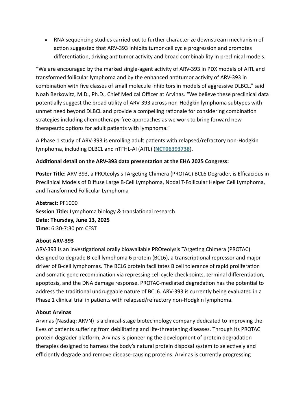 • RNA sequencing studies carried out to further characterize downstream mechanism of action suggested that ARV-393 inhibits tumor cell cycle progression and promotes differentiation, driving antitumor activity and broad combinability in preclinical models. “We are encouraged by the marked single-agent activity of ARV-393 in PDX models of AITL and transformed follicular lymphoma and by the enhanced antitumor activity of ARV-393 in combination with five classes of small molecule inhibitors in models of aggressive DLBCL,” said Noah Berkowitz, M.D., Ph.D., Chief Medical Officer at Arvinas. “We believe these preclinical data potentially suggest the broad utility of ARV-393 across non-Hodgkin lymphoma subtypes with unmet need beyond DLBCL and provide a compelling rationale for considering combination strategies including chemotherapy-free approaches as we work to bring forward new therapeutic options for adult patients with lymphoma.” A Phase 1 study of ARV-393 is enrolling adult patients with relapsed/refractory non-Hodgkin lymphoma, including DLBCL and nTFHL-Al (AITL) (NCT06393738). Additional detail on the ARV-393 data presentation at the EHA 2025 Congress: Poster Title: ARV-393, a PROteolysis TArgeting Chimera (PROTAC) BCL6 Degrader, is Efficacious in Preclinical Models of Diffuse Large B-Cell Lymphoma, Nodal T-Follicular Helper Cell Lymphoma, and Transformed Follicular Lymphoma Abstract: PF1000 Session Title: Lymphoma biology & translational research  Date: Thursday, June 13, 2025 Time: 6:30-7:30 pm CEST About ARV-393 ARV-393 is an investigational orally bioavailable PROteolysis TArgeting Chimera (PROTAC) designed to degrade B-cell lymphoma 6 protein (BCL6), a transcriptional repressor and major driver of B-cell lymphomas. The BCL6 protein facilitates B cell tolerance of rapid proliferation and somatic gene recombination via repressing cell cycle checkpoints, terminal differentiation, apoptosis, and the DNA damage response. PROTAC-mediated degradation has the potential to address the traditional undruggable nature of BCL6. ARV-393 is currently being evaluated in a Phase 1 clinical trial in patients with relapsed/refractory non-Hodgkin lymphoma. About Arvinas Arvinas (Nasdaq: ARVN) is a clinical-stage biotechnology company dedicated to improving the lives of patients suffering from debilitating and life-threatening diseases. Through its PROTAC protein degrader platform, Arvinas is pioneering the development of protein degradation therapies designed to harness the body’s natural protein disposal system to selectively and efficiently degrade and remove disease-causing proteins. Arvinas is currently progressing
