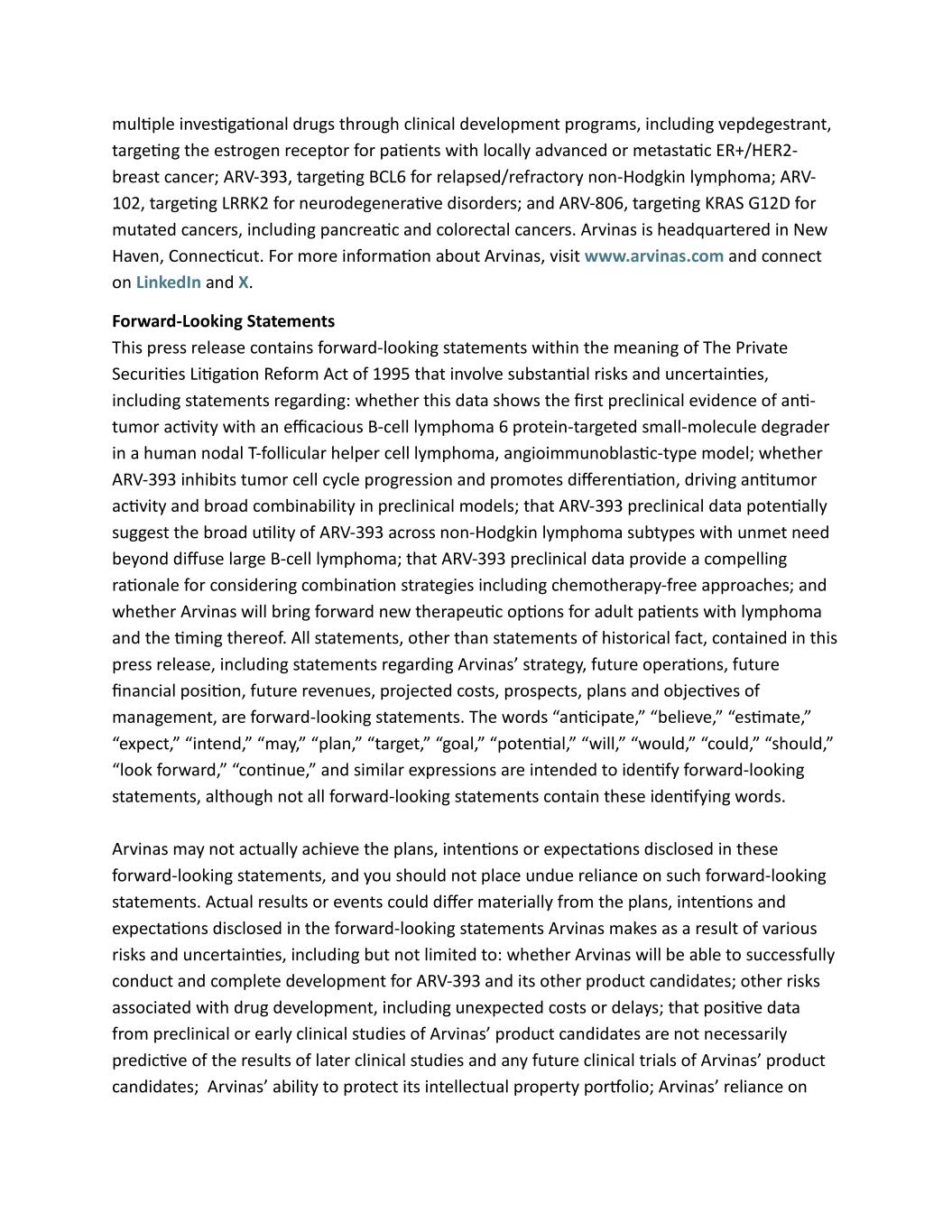 multiple investigational drugs through clinical development programs, including vepdegestrant, targeting the estrogen receptor for patients with locally advanced or metastatic ER+/HER2- breast cancer; ARV-393, targeting BCL6 for relapsed/refractory non-Hodgkin lymphoma; ARV- 102, targeting LRRK2 for neurodegenerative disorders; and ARV-806, targeting KRAS G12D for mutated cancers, including pancreatic and colorectal cancers. Arvinas is headquartered in New Haven, Connecticut. For more information about Arvinas, visit www.arvinas.com and connect on LinkedIn and X. Forward-Looking Statements This press release contains forward-looking statements within the meaning of The Private Securities Litigation Reform Act of 1995 that involve substantial risks and uncertainties, including statements regarding: whether this data shows the first preclinical evidence of anti- tumor activity with an efficacious B-cell lymphoma 6 protein-targeted small-molecule degrader in a human nodal T-follicular helper cell lymphoma, angioimmunoblastic-type model; whether ARV-393 inhibits tumor cell cycle progression and promotes differentiation, driving antitumor activity and broad combinability in preclinical models; that ARV-393 preclinical data potentially suggest the broad utility of ARV-393 across non-Hodgkin lymphoma subtypes with unmet need beyond diffuse large B-cell lymphoma; that ARV-393 preclinical data provide a compelling rationale for considering combination strategies including chemotherapy-free approaches; and whether Arvinas will bring forward new therapeutic options for adult patients with lymphoma and the timing thereof. All statements, other than statements of historical fact, contained in this press release, including statements regarding Arvinas’ strategy, future operations, future financial position, future revenues, projected costs, prospects, plans and objectives of management, are forward-looking statements. The words “anticipate,” “believe,” “estimate,” “expect,” “intend,” “may,” “plan,” “target,” “goal,” “potential,” “will,” “would,” “could,” “should,” “look forward,” “continue,” and similar expressions are intended to identify forward-looking statements, although not all forward-looking statements contain these identifying words. Arvinas may not actually achieve the plans, intentions or expectations disclosed in these forward-looking statements, and you should not place undue reliance on such forward-looking statements. Actual results or events could differ materially from the plans, intentions and expectations disclosed in the forward-looking statements Arvinas makes as a result of various risks and uncertainties, including but not limited to: whether Arvinas will be able to successfully conduct and complete development for ARV-393 and its other product candidates; other risks associated with drug development, including unexpected costs or delays; that positive data from preclinical or early clinical studies of Arvinas’ product candidates are not necessarily predictive of the results of later clinical studies and any future clinical trials of Arvinas’ product candidates; Arvinas’ ability to protect its intellectual property portfolio; Arvinas’ reliance on