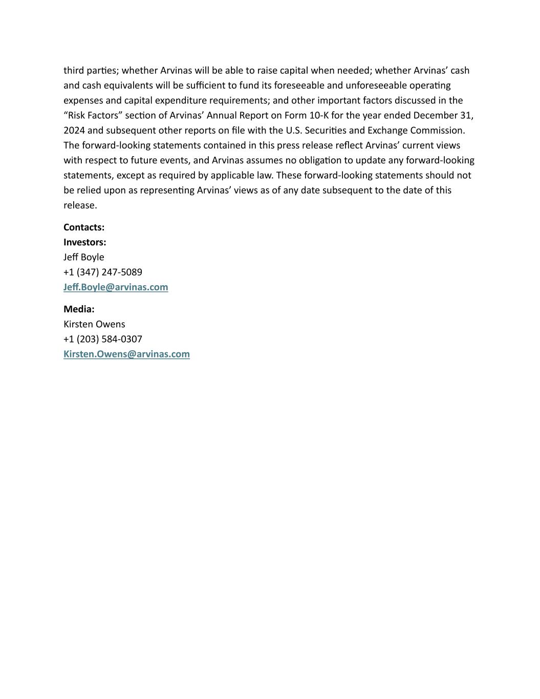 third parties; whether Arvinas will be able to raise capital when needed; whether Arvinas’ cash and cash equivalents will be sufficient to fund its foreseeable and unforeseeable operating expenses and capital expenditure requirements; and other important factors discussed in the “Risk Factors” section of Arvinas’ Annual Report on Form 10-K for the year ended December 31, 2024 and subsequent other reports on file with the U.S. Securities and Exchange Commission. The forward-looking statements contained in this press release reflect Arvinas’ current views with respect to future events, and Arvinas assumes no obligation to update any forward-looking statements, except as required by applicable law. These forward-looking statements should not be relied upon as representing Arvinas’ views as of any date subsequent to the date of this release. Contacts: Investors: Jeff Boyle +1 (347) 247-5089 Jeff.Boyle@arvinas.com Media: Kirsten Owens +1 (203) 584-0307 Kirsten.Owens@arvinas.com