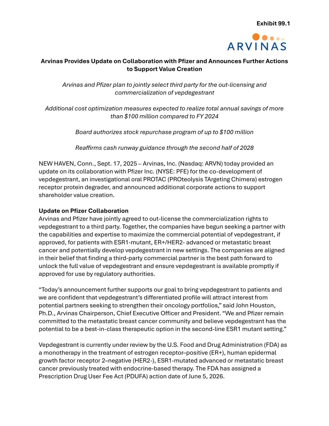 Exhibit 99.1 Arvinas Provides Update on Collaboration with Pfizer and Announces Further Actions to Support Value Creation Arvinas and Pfizer plan to jointly select third party for the out-licensing and commercialization of vepdegestrant Additional cost optimization measures expected to realize total annual savings of more than $100 million compared to FY 2024 Board authorizes stock repurchase program of up to $100 million Reaffirms cash runway guidance through the second half of 2028 NEW HAVEN, Conn., Sept. 17, 2025 – Arvinas, Inc. (Nasdaq: ARVN) today provided an update on its collaboration with Pfizer Inc. (NYSE: PFE) for the co-development of vepdegestrant, an investigational oral PROTAC (PROteolysis TArgeting Chimera) estrogen receptor protein degrader, and announced additional corporate actions to support shareholder value creation. Update on Pfizer Collaboration Arvinas and Pfizer have jointly agreed to out-license the commercialization rights to vepdegestrant to a third party. Together, the companies have begun seeking a partner with the capabilities and expertise to maximize the commercial potential of vepdegestrant, if approved, for patients with ESR1-mutant, ER+/HER2- advanced or metastatic breast cancer and potentially develop vepdegestrant in new settings. The companies are aligned in their belief that finding a third-party commercial partner is the best path forward to unlock the full value of vepdegestrant and ensure vepdegestrant is available promptly if approved for use by regulatory authorities. “Today’s announcement further supports our goal to bring vepdegestrant to patients and we are confident that vepdegestrant’s differentiated profile will attract interest from potential partners seeking to strengthen their oncology portfolios,” said John Houston, Ph.D., Arvinas Chairperson, Chief Executive Officer and President. “We and Pfizer remain committed to the metastatic breast cancer community and believe vepdegestrant has the potential to be a best-in-class therapeutic option in the second-line ESR1 mutant setting.” Vepdegestrant is currently under review by the U.S. Food and Drug Administration (FDA) as a monotherapy in the treatment of estrogen receptor–positive (ER+), human epidermal growth factor receptor 2–negative (HER2-), ESR1-mutated advanced or metastatic breast cancer previously treated with endocrine-based therapy. The FDA has assigned a Prescription Drug User Fee Act (PDUFA) action date of June 5, 2026.