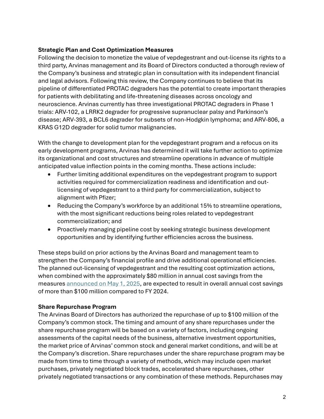 2 Strategic Plan and Cost Optimization Measures Following the decision to monetize the value of vepdegestrant and out-license its rights to a third party, Arvinas management and its Board of Directors conducted a thorough review of the Company’s business and strategic plan in consultation with its independent financial and legal advisors. Following this review, the Company continues to believe that its pipeline of differentiated PROTAC degraders has the potential to create important therapies for patients with debilitating and life-threatening diseases across oncology and neuroscience. Arvinas currently has three investigational PROTAC degraders in Phase 1 trials: ARV-102, a LRRK2 degrader for progressive supranuclear palsy and Parkinson’s disease; ARV-393, a BCL6 degrader for subsets of non-Hodgkin lymphoma; and ARV-806, a KRAS G12D degrader for solid tumor malignancies. With the change to development plan for the vepdegestrant program and a refocus on its early development programs, Arvinas has determined it will take further action to optimize its organizational and cost structures and streamline operations in advance of multiple anticipated value inflection points in the coming months. These actions include: • Further limiting additional expenditures on the vepdegestrant program to support activities required for commercialization readiness and identification and out- licensing of vepdegestrant to a third party for commercialization, subject to alignment with Pfizer; • Reducing the Company’s workforce by an additional 15% to streamline operations, with the most significant reductions being roles related to vepdegestrant commercialization; and • Proactively managing pipeline cost by seeking strategic business development opportunities and by identifying further efficiencies across the business. These steps build on prior actions by the Arvinas Board and management team to strengthen the Company’s financial profile and drive additional operational efficiencies. The planned out-licensing of vepdegestrant and the resulting cost optimization actions, when combined with the approximately $80 million in annual cost savings from the measures announced on May 1, 2025, are expected to result in overall annual cost savings of more than $100 million compared to FY 2024. Share Repurchase Program The Arvinas Board of Directors has authorized the repurchase of up to $100 million of the Company’s common stock. The timing and amount of any share repurchases under the share repurchase program will be based on a variety of factors, including ongoing assessments of the capital needs of the business, alternative investment opportunities, the market price of Arvinas’ common stock and general market conditions, and will be at the Company’s discretion. Share repurchases under the share repurchase program may be made from time to time through a variety of methods, which may include open market purchases, privately negotiated block trades, accelerated share repurchases, other privately negotiated transactions or any combination of these methods. Repurchases may