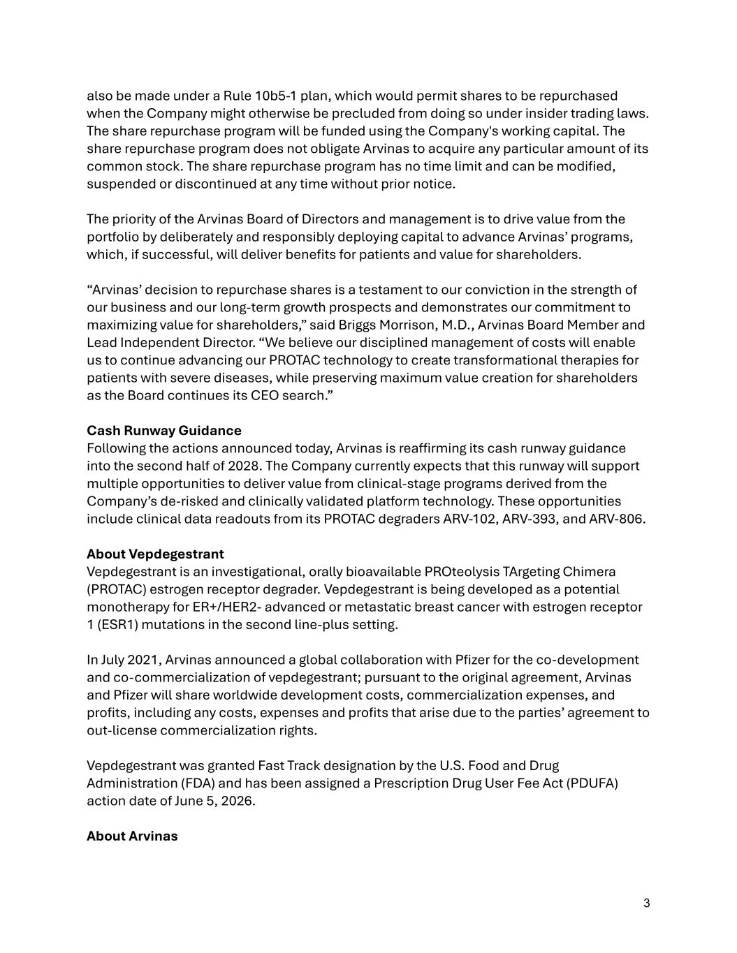 3 also be made under a Rule 10b5-1 plan, which would permit shares to be repurchased when the Company might otherwise be precluded from doing so under insider trading laws. The share repurchase program will be funded using the Company's working capital. The share repurchase program does not obligate Arvinas to acquire any particular amount of its common stock. The share repurchase program has no time limit and can be modified, suspended or discontinued at any time without prior notice. The priority of the Arvinas Board of Directors and management is to drive value from the portfolio by deliberately and responsibly deploying capital to advance Arvinas’ programs, which, if successful, will deliver benefits for patients and value for shareholders. “Arvinas’ decision to repurchase shares is a testament to our conviction in the strength of our business and our long-term growth prospects and demonstrates our commitment to maximizing value for shareholders,” said Briggs Morrison, M.D., Arvinas Board Member and Lead Independent Director. “We believe our disciplined management of costs will enable us to continue advancing our PROTAC technology to create transformational therapies for patients with severe diseases, while preserving maximum value creation for shareholders as the Board continues its CEO search.” Cash Runway Guidance Following the actions announced today, Arvinas is reaffirming its cash runway guidance into the second half of 2028. The Company currently expects that this runway will support multiple opportunities to deliver value from clinical-stage programs derived from the Company’s de-risked and clinically validated platform technology. These opportunities include clinical data readouts from its PROTAC degraders ARV-102, ARV-393, and ARV-806. About Vepdegestrant Vepdegestrant is an investigational, orally bioavailable PROteolysis TArgeting Chimera (PROTAC) estrogen receptor degrader. Vepdegestrant is being developed as a potential monotherapy for ER+/HER2- advanced or metastatic breast cancer with estrogen receptor 1 (ESR1) mutations in the second line-plus setting. In July 2021, Arvinas announced a global collaboration with Pfizer for the co-development and co-commercialization of vepdegestrant; pursuant to the original agreement, Arvinas and Pfizer will share worldwide development costs, commercialization expenses, and profits, including any costs, expenses and profits that arise due to the parties’ agreement to out-license commercialization rights. Vepdegestrant was granted Fast Track designation by the U.S. Food and Drug Administration (FDA) and has been assigned a Prescription Drug User Fee Act (PDUFA) action date of June 5, 2026. About Arvinas