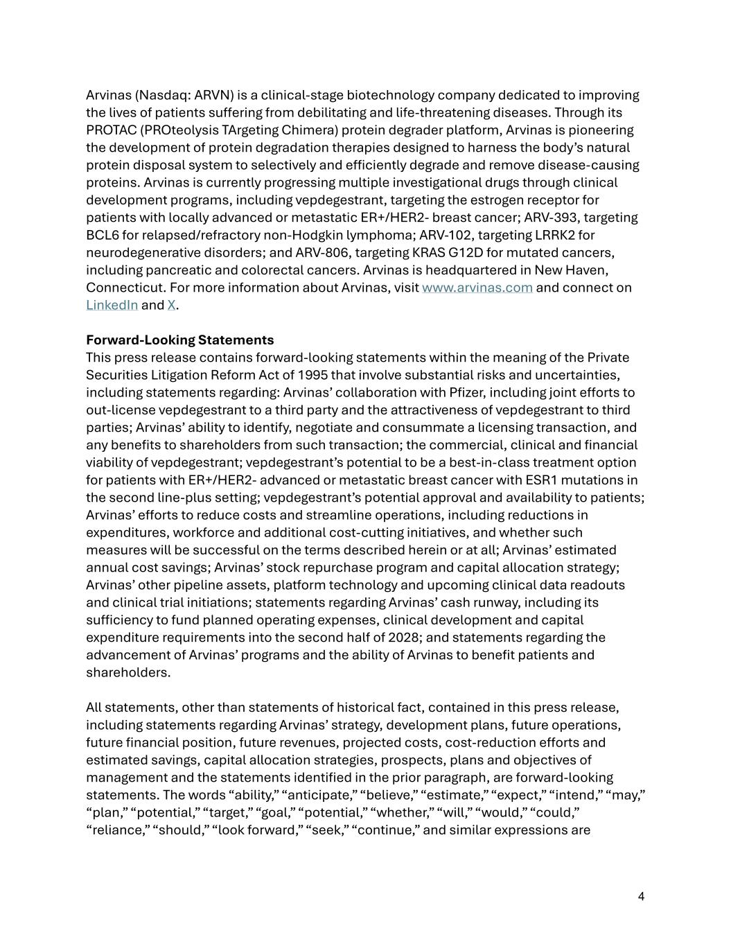4 Arvinas (Nasdaq: ARVN) is a clinical-stage biotechnology company dedicated to improving the lives of patients suffering from debilitating and life-threatening diseases. Through its PROTAC (PROteolysis TArgeting Chimera) protein degrader platform, Arvinas is pioneering the development of protein degradation therapies designed to harness the body’s natural protein disposal system to selectively and efficiently degrade and remove disease-causing proteins. Arvinas is currently progressing multiple investigational drugs through clinical development programs, including vepdegestrant, targeting the estrogen receptor for patients with locally advanced or metastatic ER+/HER2- breast cancer; ARV-393, targeting BCL6 for relapsed/refractory non-Hodgkin lymphoma; ARV-102, targeting LRRK2 for neurodegenerative disorders; and ARV-806, targeting KRAS G12D for mutated cancers, including pancreatic and colorectal cancers. Arvinas is headquartered in New Haven, Connecticut. For more information about Arvinas, visit www.arvinas.com and connect on LinkedIn and X. Forward-Looking Statements This press release contains forward-looking statements within the meaning of the Private Securities Litigation Reform Act of 1995 that involve substantial risks and uncertainties, including statements regarding: Arvinas’ collaboration with Pfizer, including joint efforts to out-license vepdegestrant to a third party and the attractiveness of vepdegestrant to third parties; Arvinas’ ability to identify, negotiate and consummate a licensing transaction, and any benefits to shareholders from such transaction; the commercial, clinical and financial viability of vepdegestrant; vepdegestrant’s potential to be a best-in-class treatment option for patients with ER+/HER2- advanced or metastatic breast cancer with ESR1 mutations in the second line-plus setting; vepdegestrant’s potential approval and availability to patients; Arvinas’ efforts to reduce costs and streamline operations, including reductions in expenditures, workforce and additional cost-cutting initiatives, and whether such measures will be successful on the terms described herein or at all; Arvinas’ estimated annual cost savings; Arvinas’ stock repurchase program and capital allocation strategy; Arvinas’ other pipeline assets, platform technology and upcoming clinical data readouts and clinical trial initiations; statements regarding Arvinas’ cash runway, including its sufficiency to fund planned operating expenses, clinical development and capital expenditure requirements into the second half of 2028; and statements regarding the advancement of Arvinas’ programs and the ability of Arvinas to benefit patients and shareholders. All statements, other than statements of historical fact, contained in this press release, including statements regarding Arvinas’ strategy, development plans, future operations, future financial position, future revenues, projected costs, cost-reduction efforts and estimated savings, capital allocation strategies, prospects, plans and objectives of management and the statements identified in the prior paragraph, are forward-looking statements. The words “ability,” “anticipate,” “believe,” “estimate,” “expect,” “intend,” “may,” “plan,” “potential,” “target,” “goal,” “potential,” “whether,” “will,” “would,” “could,” “reliance,” “should,” “look forward,” “seek,” “continue,” and similar expressions are