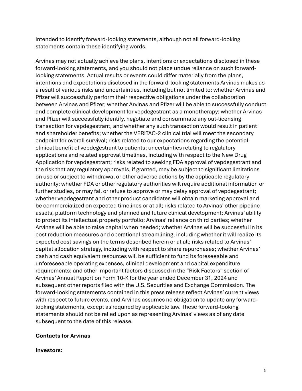 5 intended to identify forward-looking statements, although not all forward-looking statements contain these identifying words. Arvinas may not actually achieve the plans, intentions or expectations disclosed in these forward-looking statements, and you should not place undue reliance on such forward- looking statements. Actual results or events could differ materially from the plans, intentions and expectations disclosed in the forward-looking statements Arvinas makes as a result of various risks and uncertainties, including but not limited to: whether Arvinas and Pfizer will successfully perform their respective obligations under the collaboration between Arvinas and Pfizer; whether Arvinas and Pfizer will be able to successfully conduct and complete clinical development for vepdegestrant as a monotherapy; whether Arvinas and Pfizer will successfully identify, negotiate and consummate any out-licensing transaction for vepdegestrant, and whether any such transaction would result in patient and shareholder benefits; whether the VERITAC-2 clinical trial will meet the secondary endpoint for overall survival; risks related to our expectations regarding the potential clinical benefit of vepdegestrant to patients; uncertainties relating to regulatory applications and related approval timelines, including with respect to the New Drug Application for vepdegestrant; risks related to seeking FDA approval of vepdegestrant and the risk that any regulatory approvals, if granted, may be subject to significant limitations on use or subject to withdrawal or other adverse actions by the applicable regulatory authority; whether FDA or other regulatory authorities will require additional information or further studies, or may fail or refuse to approve or may delay approval of vepdegestrant; whether vepdegestrant and other product candidates will obtain marketing approval and be commercialized on expected timelines or at all; risks related to Arvinas’ other pipeline assets, platform technology and planned and future clinical development; Arvinas’ ability to protect its intellectual property portfolio; Arvinas’ reliance on third parties; whether Arvinas will be able to raise capital when needed; whether Arvinas will be successful in its cost reduction measures and operational streamlining, including whether it will realize its expected cost savings on the terms described herein or at all; risks related to Arvinas’ capital allocation strategy, including with respect to share repurchases; whether Arvinas’ cash and cash equivalent resources will be sufficient to fund its foreseeable and unforeseeable operating expenses, clinical development and capital expenditure requirements; and other important factors discussed in the “Risk Factors” section of Arvinas’ Annual Report on Form 10-K for the year ended December 31, 2024 and subsequent other reports filed with the U.S. Securities and Exchange Commission. The forward-looking statements contained in this press release reflect Arvinas’ current views with respect to future events, and Arvinas assumes no obligation to update any forward- looking statements, except as required by applicable law. These forward-looking statements should not be relied upon as representing Arvinas’ views as of any date subsequent to the date of this release. Contacts for Arvinas Investors: