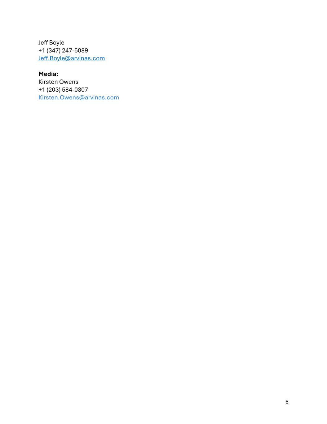 6 Jeff Boyle +1 (347) 247-5089 Jeff.Boyle@arvinas.com Media: Kirsten Owens +1 (203) 584-0307 Kirsten.Owens@arvinas.com