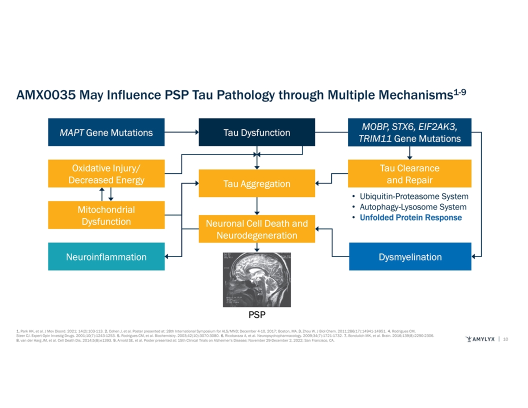 Pathophysiologic Changes Underlying PSP Provide Multiple Pathways to Target M MO OB BP P,, S ST TX X6 6,, E EIIF F2 2A AK K3 3,, M MA AP PT T G Ge en ne e M Mu ut ta at tiio on ns s T Ta au u D Dy ys sf fu un nc ct tiio on n T TR RIIM M1 11 1 G Ge en ne e M Mu ut ta at tiio on ns s O Ox xiid da at tiiv ve e IIn njju ur ry y/ / T Ta au u C Clle ea ar ra an nc ce e D De ec cr re ea as se ed d E En ne er rg gy y a an nd d R Re ep pa aiir r T Ta au u A Ag gg gr re eg ga at tiio on n • Ubiquitin-Proteasome System • Autophagy-Lysosome System M Miit to oc ch ho on nd dr riia all • Unfolded Protein Response D Dy ys sf fu un nc ct tiio on n N Ne eu ur ro on na all C Ce ellll D De ea at th h a an nd d N Ne eu ur ro od de eg ge en ne er ra at tiio on n N Ne eu ur ro oiin nf flla am mm ma at tiio on n D Dy ys sm my ye elliin na at tiio on n PSP Park HK, et al. J Mov Disord. 2021; 14(2):103-113. 9