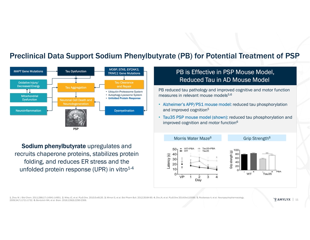 1-9 AMX0035 May Influence PSP Tau Pathology through Multiple Mechanisms M MO OB BP P,, S ST TX X6 6,, E EIIF F2 2A AK K3 3,, M MA AP PT T G Ge en ne e M Mu ut ta at tiio on ns s T Ta au u D Dy ys sf fu un nc ct tiio on n T TR RIIM M1 11 1 G Ge en ne e M Mu ut ta at tiio on ns s O Ox xiid da at tiiv ve e IIn njju ur ry y/ / T Ta au u C Clle ea ar ra an nc ce e D De ec cr re ea as se ed d E En ne er rg gy y a an nd d R Re ep pa aiir r T Ta au u A Ag gg gr re eg ga at tiio on n • Ubiquitin-Proteasome System • Autophagy-Lysosome System M Miit to oc ch ho on nd dr riia all • Unfolded Protein Response D Dy ys sf fu un nc ct tiio on n N Ne eu ur ro on na all C Ce ellll D De ea at th h a an nd d N Ne eu ur ro od de eg ge en ne er ra at tiio on n N Ne eu ur ro oiin nf flla am mm ma at tiio on n D Dy ys sm my ye elliin na at tiio on n PSP 1. Park HK, et al. J Mov Disord. 2021; 14(2):103-113. 2. Cohen J, et al. Poster presented at: 28th International Symposium for ALS/MND; December 4-10, 2017; Boston, MA. 3. Zhou W. J Biol Chem. 2011;286(17):14941-14951. 4. Rodrigues CM, Steer CJ. Expert Opin Investig Drugs. 2001;10(7):1243-1253. 5. Rodrigues CM, et al. Biochemistry. 2003;42(10):3070-3080. 6. Ricobaraza A, et al. Neuropsychopharmacology. 2009;34(7):1721-1732. 7. Bondulich MK, et al. Brain. 2016;139(8):2290-2306. 10 8. van der Harg JM, et al. Cell Death Dis. 2014;5(8):e1393. 9. Arnold SE, et al. Poster presented at: 15th Clinical Trials on Alzheimer’s Disease; November 29-December 2, 2022; San Francisco, CA.
