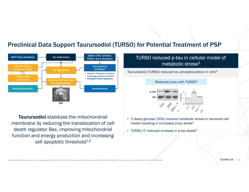 Preclinical Data Support Taurursodiol (TURSO) for Potential Treatment of PSP MOBP, STX6, EIF2AK3, MAPT Gene Mutations Tau Dysfunction TURSO reduced p-tau in cellular model of TRIM11 Gene Mutations 3 metabolic stress Oxidative Injury/ Tau Clearance T Ta au u C Clle ea ar ra an nc ce e Decreased Energy a a an n nd d d R R Re e ep p pa a aiiir r r Tau Aggregation 3 Taurursodiol (TURSO) reduced tau phosphorylation in vitro • Ubiquitin-Proteasome System • Autophagy-Lysosome System Mitochondrial • Unfolded Protein Response Dysfunction Neuronal Cell Death and 3 Reduced p-tau with TURSO Neurodegeneration Neuroinflammation Dysmyelination PSP Taurursodiol stabilizes the mitochondrial • 2 deoxy glucose (2DG) induced metabolic stress in neuronal cell 3 model resulting in increased p-tau levels membrane by reducing the translocation of cell 3 death regulator Bax, improving mitochondrial • TURSO (T) reduced increase in p-tau levels function and energy production and increasing 1,2 cell apoptotic threshold 12 1. Rodrigues CM, Steer CJ. Expert Opin Investig Drugs. 2001;10(7):1243-1253. 2. Rodrigues CM, et al. Biochemistry. 2003;42(10):3070-3080. 3. van der Harg JM, et al. Cell Death Dis. 2014;5(8):e1393.