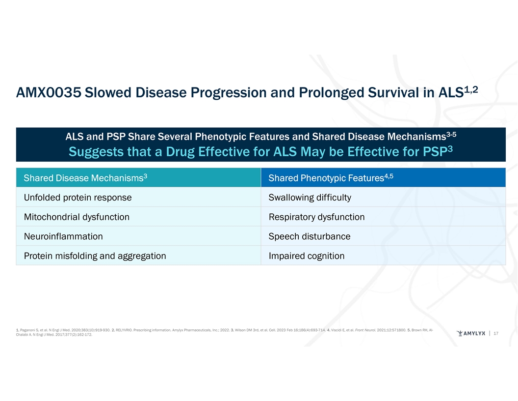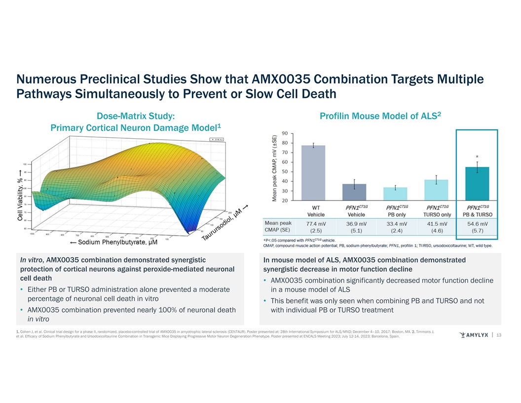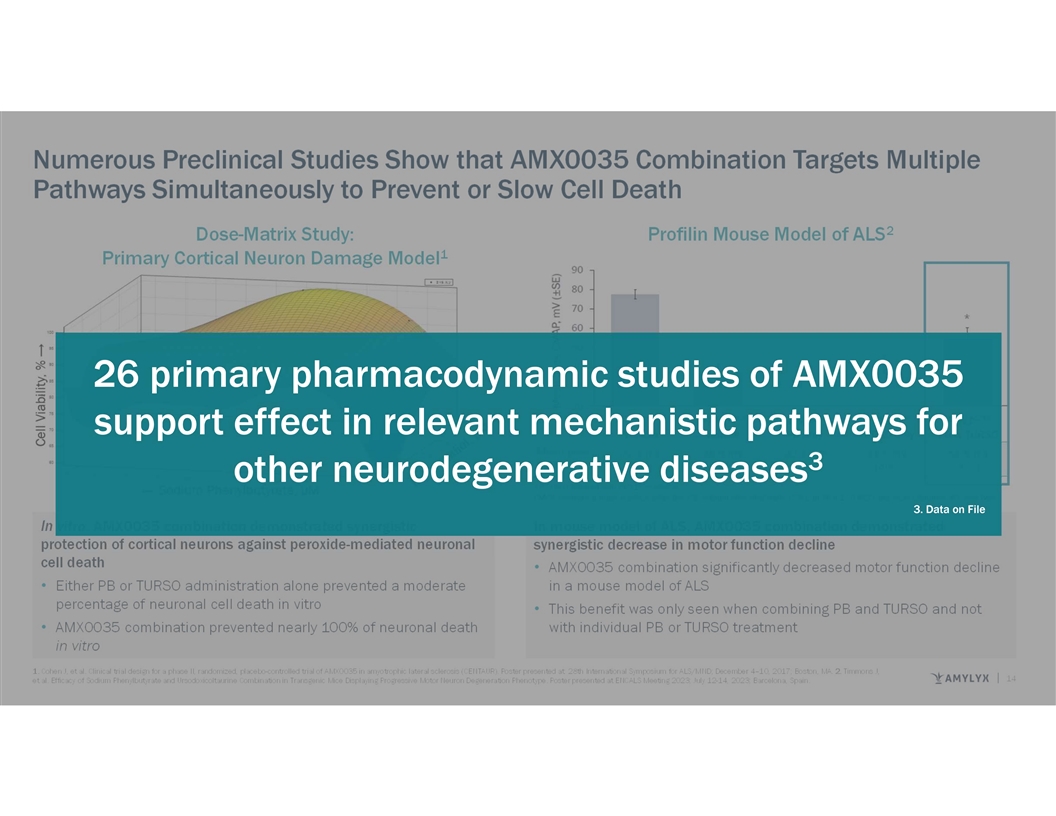 Numerous Preclinical Studies Show that AMX0035 Combination Targets Multiple Pathways Simultaneously to Prevent or Slow Cell Death 2 Dose-Matrix Study: Profilin Mouse Model of ALS 1 Primary Cortical Neuron Damage Model I In n v viit tr ro o,, A AM MX X0 00 03 35 5 c co om mb biin na at tiio on n d de em mo on ns st tr ra at te ed d s sy yn ne er rg giis st tiic c I In n m mo ou us se e m mo od de ell o of f A AL LS S,, A AM MX X0 00 03 35 5 c co om mb biin na at tiio on n d de em mo on ns st tr ra at te ed d p pr ro ot te ec ct tiio on n o of f c co or rt tiic ca all n ne eu ur ro on ns s a ag ga aiin ns st t p pe er ro ox xiid de e--m me ed diia at te ed d n ne eu ur ro on na all s sy yn ne er rg giis st tiic c d de ec cr re ea as se e iin n m mo ot to or r f fu un nc ct tiio on n d de ec clliin ne e c ce ellll d de ea at th h •• A AM MX X0 00 03 35 5 c co om mb biin na at tiio on n s siig gn niif fiic ca an nt tlly y d de ec cr re ea as se ed d m mo ot to or r f fu un nc ct tiio on n d de ec clliin ne e •• E Eiit th he er r P PB B o or r T TU UR RS SO O a ad dm miin niis st tr ra at tiio on n a allo on ne e p pr re ev ve en nt te ed d a a m mo od de er ra at te e iin n a a m mo ou us se e m mo od de ell o of f A AL LS S p pe er rc ce en nt ta ag ge e o of f n ne eu ur ro on na all c ce ellll d de ea at th h iin n v viit tr ro o •• T Th hiis s b be en ne ef fiit t w wa as s o on nlly y s se ee en n w wh he en n c co om mb biin niin ng g P PB B a an nd d T TU UR RS SO O a an nd d n no ot t •• A AM MX X0 00 03 35 5 c co om mb biin na at tiio on n p pr re ev ve en nt te ed d n ne ea ar rlly y 1 10 00 0% % o of f n ne eu ur ro on na all d de ea at th h w wiit th h iin nd diiv viid du ua all P PB B o or r T TU UR RS SO O t tr re ea at tm me en nt t iin n v viit tr ro o 1. Cohen J, et al. Clinical trial design for a phase II, randomized, placebo-controlled trial of AMX0035 in amyotrophic lateral sclerosis (CENTAUR). Poster presented at: 28th International Symposium for ALS/MND; December 4–10, 2017; Boston, MA. 2. Timmons J, 13 et al. Efficacy of Sodium Phenylbutyrate and Ursodoxicoltaurine Combination in Transgenic Mice Displaying Progressive Motor Neuron Degeneration Phenotype. Poster presented at ENCALS Meeting 2023; July 12-14, 2023; Barcelona, Spain.