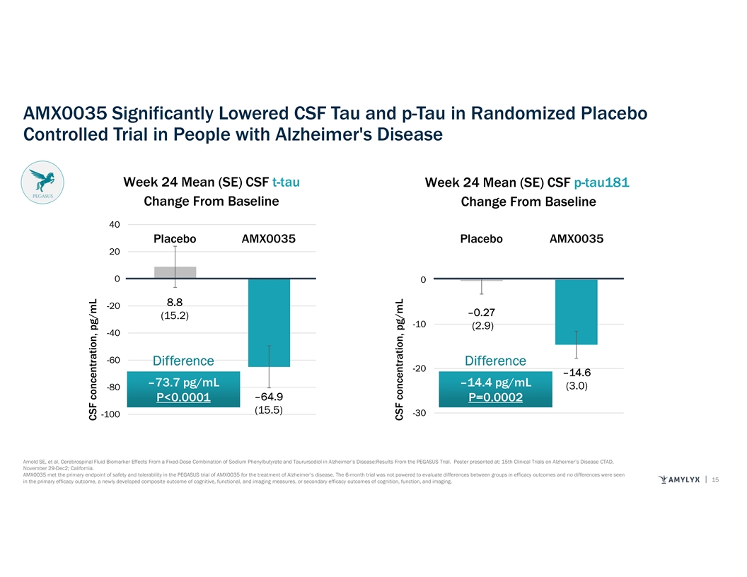 AMX0035 Significantly Lowered CSF Tau and p-Tau in Randomized Placebo Controlled Trial in People with Alzheimer's Disease Week 24 Mean (SE) CSF t-tau Week 24 Mean (SE) CSF p-tau181 Change From Baseline Change From Baseline 40 Placebo AMX0035 Placebo AMX0035 20 0 0 8.8 -20 –0.27 (15.2) -10 (2.9) -40 -60 Difference Difference -20 –14.6 – –7 73 3..7 7 p pg g/ /m mL L – –1 14 4..4 4 p pg g/ /m mL L (3.0) -80 –64.9 P P< <0 0..0 00 00 01 1 P P= =0 0..0 00 00 02 2 (15.5) -30 -100 Arnold SE, et al. Cerebrospinal Fluid Biomarker Effects From a Fixed-Dose Combination of Sodium Phenylbutyrate and Taurursodiol in Alzheimer’s Disease:Results From the PEGASUS Trial. Poster presented at: 15th Clinical Trials on Alzheimer’s Disease CTAD, November 29-Dec2; California. AMX0035 met the primary endpoint of safety and tolerability in the PEGASUS trial of AMX0035 for the treatment of Alzheimer’s disease. The 6-month trial was not powered to evaluate differences between groups in efficacy outcomes and no differences were seen 15 in the primary efficacy outcome, a newly developed composite outcome of cognitive, functional, and imaging measures, or secondary efficacy outcomes of cognition, function, and imaging. CSF concentration, pg/mL CSF concentration, pg/mL