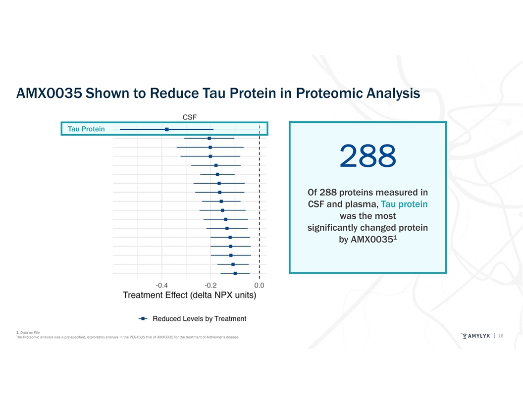 AMX0035 Shown to Reduce Tau Protein in Proteomic Analysis Tau Protein 288 Of 288 proteins measured in CSF and plasma, Tau protein was the most significantly changed protein 1 by AMX0035 1. Data on File 16 The Proteomic analysis was a pre-specified, exploratory analysis in the PEGASUS trial of AMX0035 for the treatment of Alzheimer’s disease.
