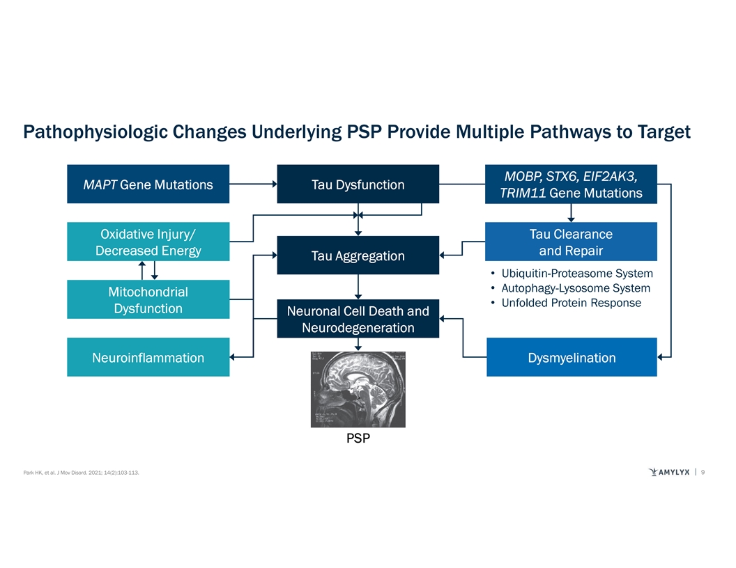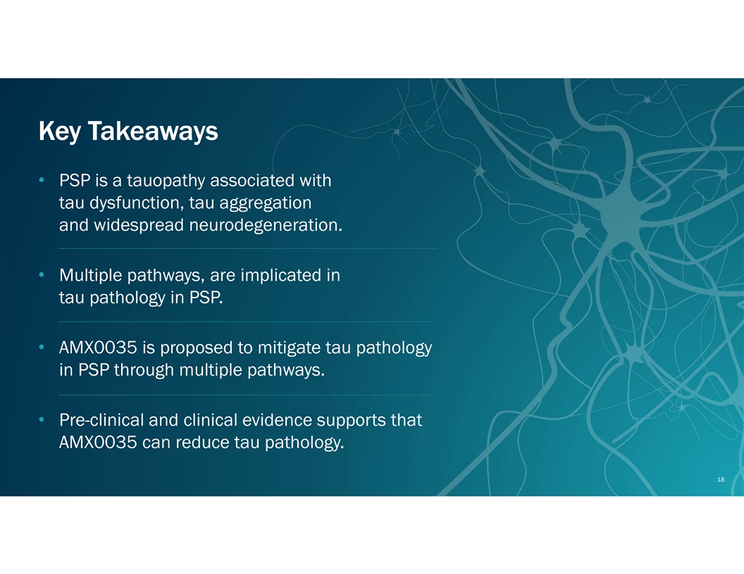 Key Takeaways • PSP is a tauopathy associated with tau dysfunction, tau aggregation and widespread neurodegeneration. • Multiple pathways, are implicated in tau pathology in PSP. • AMX0035 is proposed to mitigate tau pathology in PSP through multiple pathways. • Pre-clinical and clinical evidence supports that AMX0035 can reduce tau pathology. 18