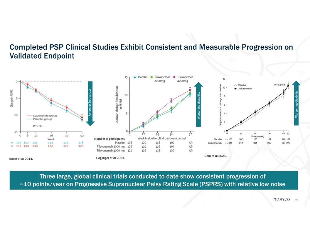 Worsening disability Completed PSP Clinical Studies Exhibit Consistent and Measurable Progression on Validated Endpoint Dam et al 2021. Höglinger et al 2021. Boxer et al 2014. Three large, global clinical trials conducted to date show consistent progression of ~10 points/year on Progressive Supranuclear Palsy Rating Scale (PSPRS) with relative low noise 20 Worsening disability Worsening disability