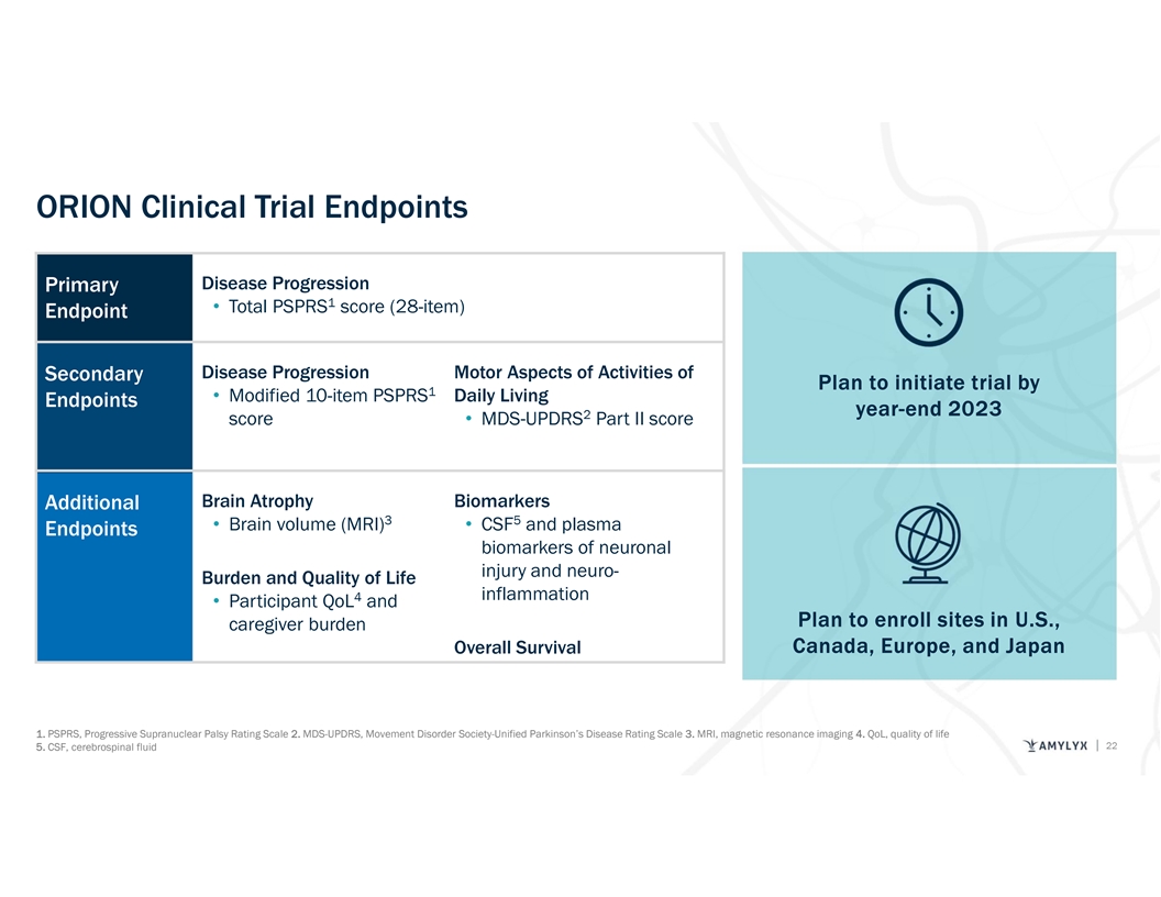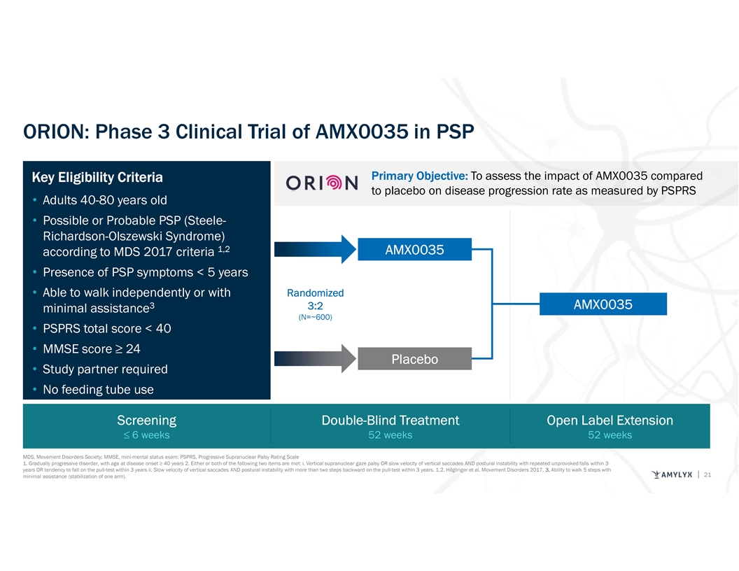 ORION: Phase 3 Clinical Trial of AMX0035 in PSP Primary Objective: To assess the impact of AMX0035 compared Key Eligibility Criteria to placebo on disease progression rate as measured by PSPRS • Adults 40-80 years old • Possible or Probable PSP (Steele- Richardson-Olszewski Syndrome) 1,2 AMX0035 according to MDS 2017 criteria • Presence of PSP symptoms < 5 years • Able to walk independently or with Randomized 3 AMX0035 3:2 minimal assistance (N=~600) • PSPRS total score < 40 • MMSE score ≥ 24 Placebo • Study partner required • No feeding tube use Screening Double-Blind Treatment Open Label Extension ≤ 6 weeks 52 weeks 52 weeks MDS, Movement Disorders Society; MMSE, mini-mental status exam; PSPRS, Progressive Supranuclear Palsy Rating Scale 1. Gradually progressive disorder, with age at disease onset ≥ 40 years 2. Either or both of the following two items are met: i. Vertical supranuclear gaze palsy OR slow velocity of vertical saccades AND postural instability with repeated unprovoked falls within 3 years OR tendency to fall on the pull-test within 3 years ii. Slow velocity of vertical saccades AND postural instability with more than two steps backward on the pull-test within 3 years. 1,2. Höglinger et al. Movement Disorders 2017. 3. Ability to walk 5 steps with 21 minimal assistance (stabilization of one arm).