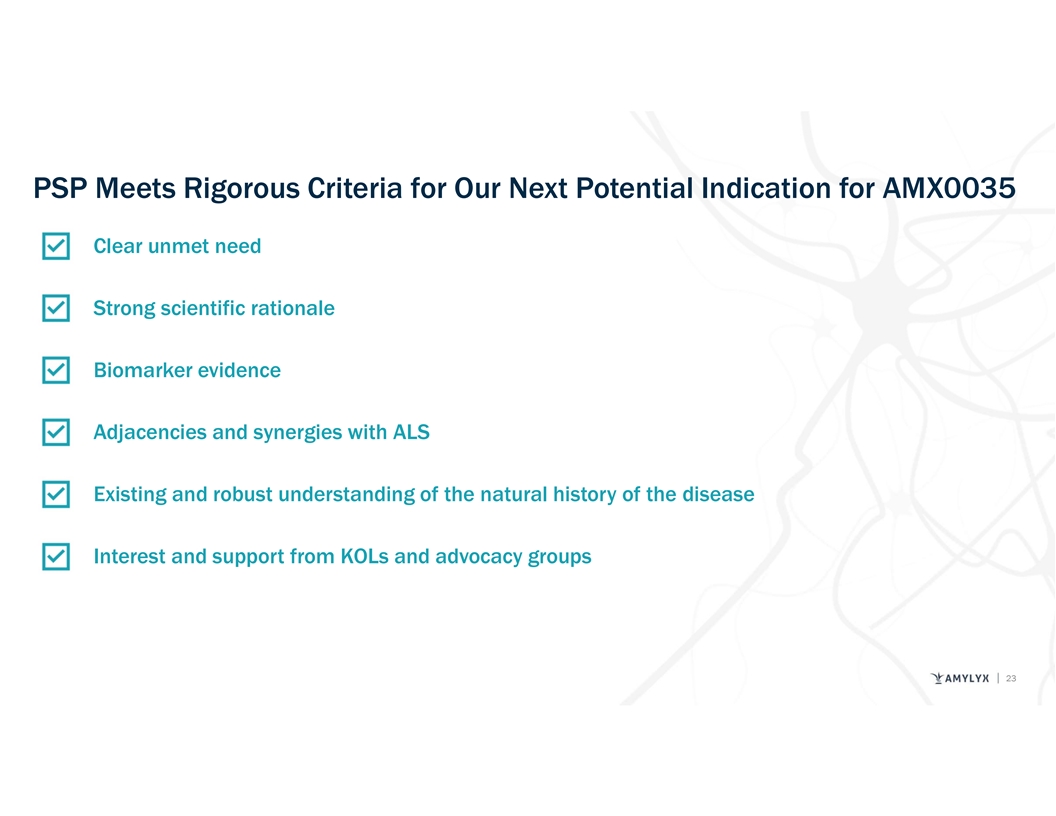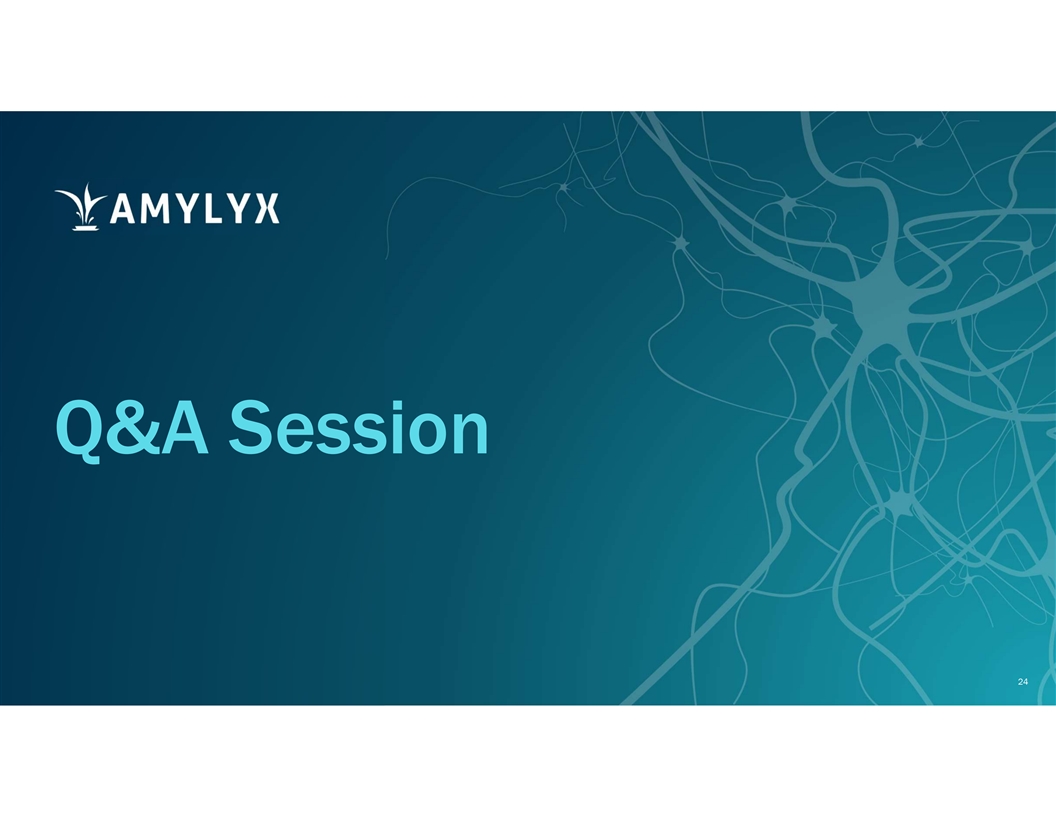 PSP Meets Rigorous Criteria for Our Next Potential Indication for AMX0035 Clear unmet need Strong scientific rationale Biomarker evidence Adjacencies and synergies with ALS Existing and robust understanding of the natural history of the disease Interest and support from KOLs and advocacy groups 23