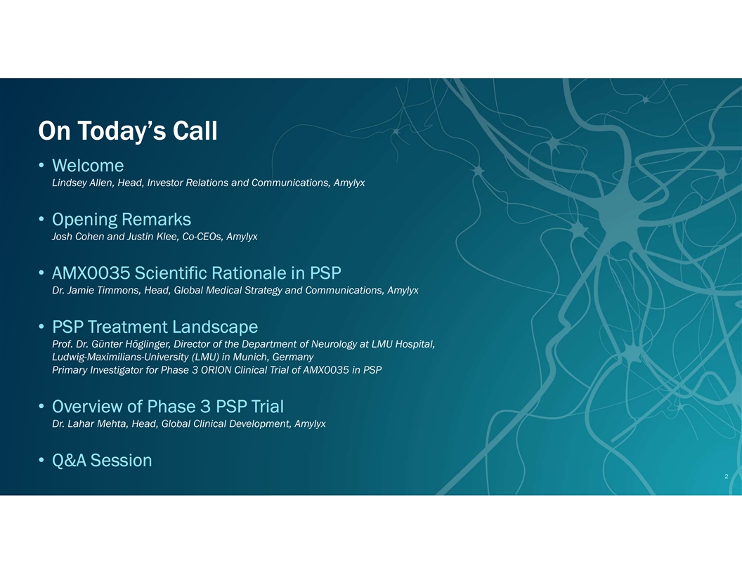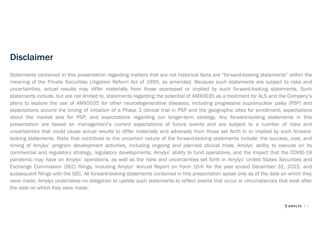 On Today’s Call • Welcome Lindsey Allen, Head, Investor Relations and Communications, Amylyx • Opening Remarks Josh Cohen and Justin Klee, Co-CEOs, Amylyx • AMX0035 Scientific Rationale in PSP Dr. Jamie Timmons, Head, Global Medical Strategy and Communications, Amylyx • PSP Treatment Landscape Prof. Dr. Günter Höglinger, Director of the Department of Neurology at LMU Hospital, Ludwig-Maximilians-University (LMU) in Munich, Germany Primary Investigator for Phase 3 ORION Clinical Trial of AMX0035 in PSP • Overview of Phase 3 PSP Trial Dr. Lahar Mehta, Head, Global Clinical Development, Amylyx • Q&A Session 2