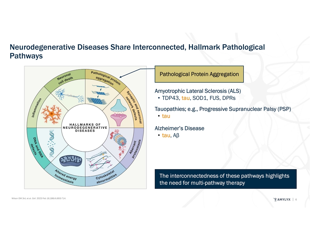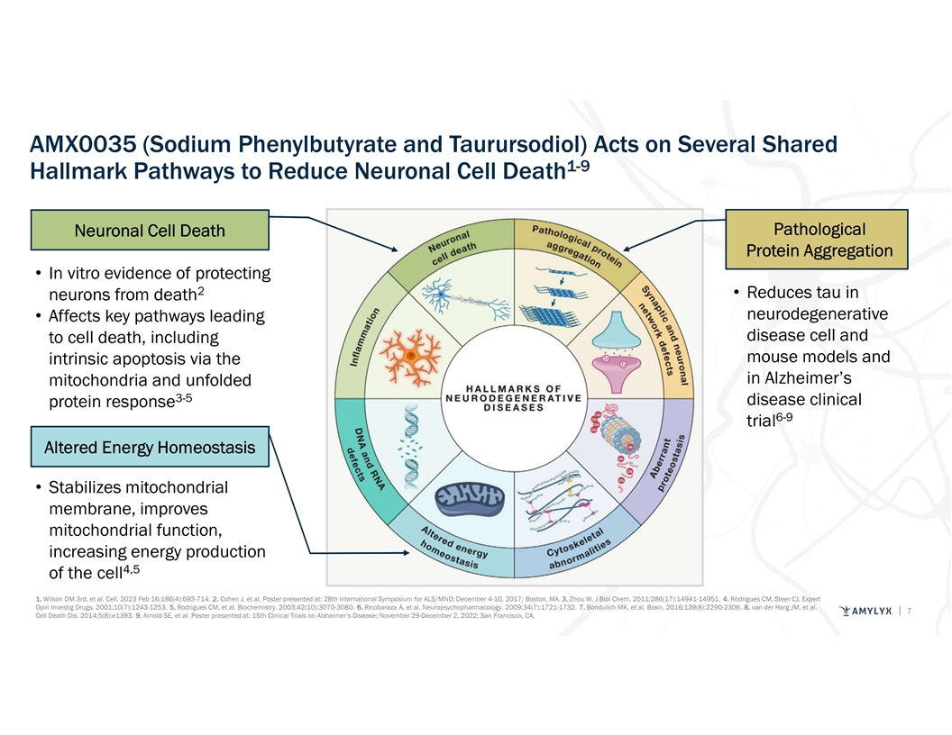 Neurodegenerative Diseases Share Interconnected, Hallmark Pathological Pathways Pathological Protein Aggregation Amyotrophic Lateral Sclerosis (ALS) • TDP43, tau, SOD1, FUS, DPRs Tauopathies; e.g., Progressive Supranuclear Palsy (PSP) • tau Alzheimer’s Disease • tau, Aβ The interconnectedness of these pathways highlights the need for multi-pathway therapy Wilson DM 3rd, et al. Cell. 2023 Feb 16;186(4):693-714. 6
