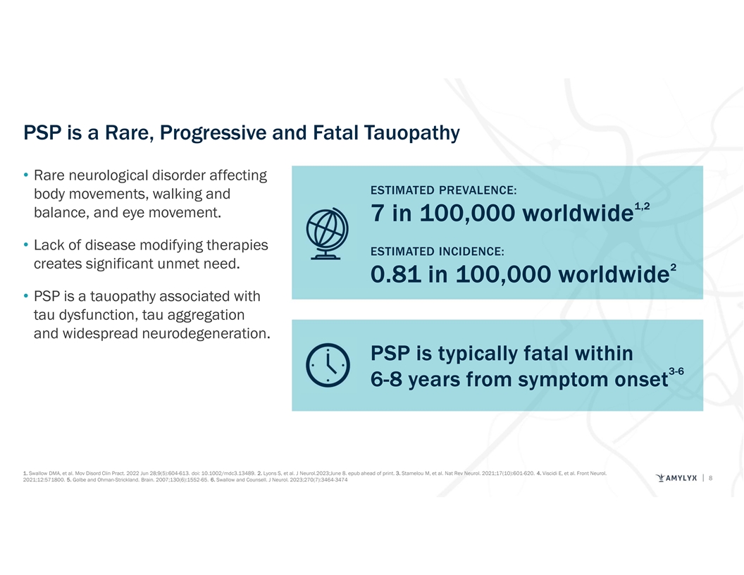 PSP is a Rare, Progressive and Fatal Tauopathy • Rare neurological disorder affecting ESTIMATED PREVALENCE: body movements, walking and 1,2 balance, and eye movement. 7 in 100,000 worldwide • Lack of disease modifying therapies ESTIMATED INCIDENCE: creates significant unmet need. 2 0.81 in 100,000 worldwide • PSP is a tauopathy associated with tau dysfunction, tau aggregation and widespread neurodegeneration. PSP is typically fatal within 3-6 6-8 years from symptom onset 1. Swallow DMA, et al. Mov Disord Clin Pract. 2022 Jun 28;9(5):604-613. doi: 10.1002/mdc3.13489. 2. Lyons S, et al. J Neurol.2023;June 8. epub ahead of print. 3. Stamelou M, et al. Nat Rev Neurol. 2021;17(10):601-620. 4. Viscidi E, et al. Front Neurol. 8 2021;12:571800. 5. Golbe and Ohman-Strickland. Brain. 2007;130(6):1552-65. 6. Swallow and Counsell. J Neurol. 2023;270(7):3464-3474