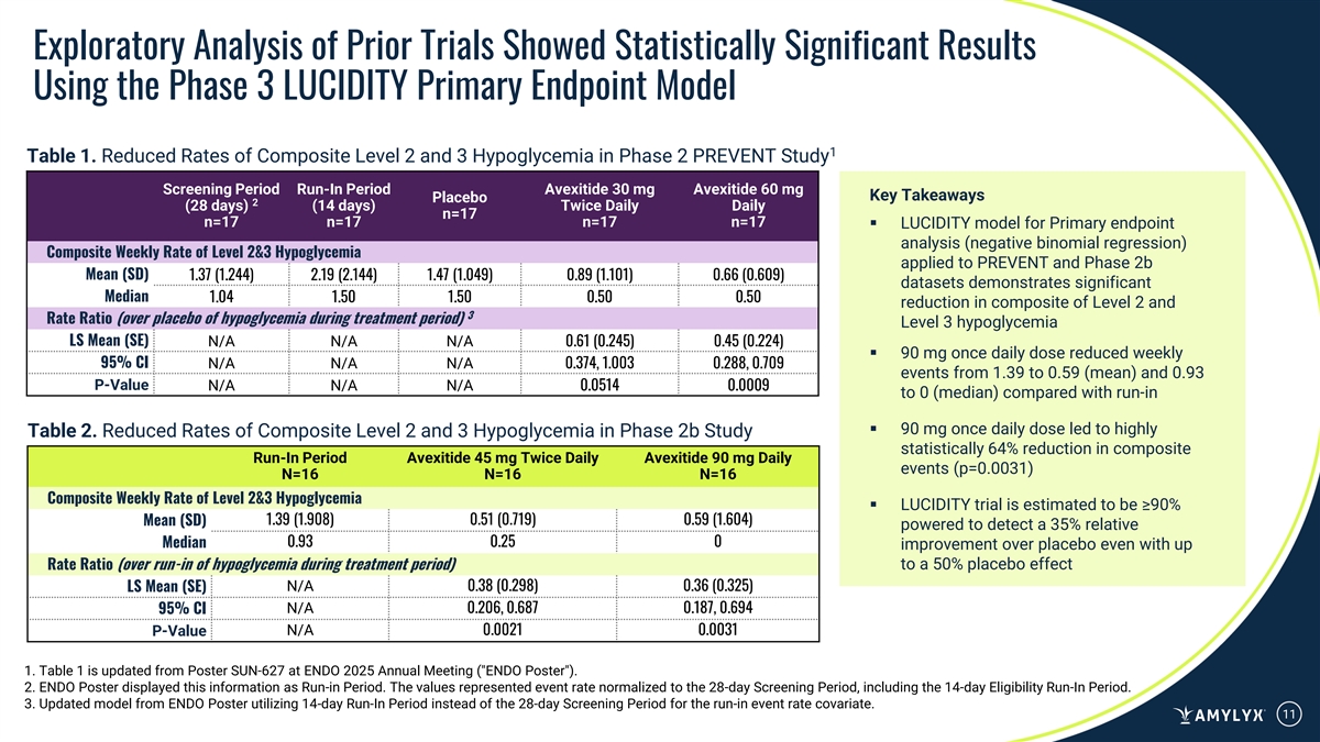 Exploratory Analysis of Prior Trials Showed Statistically Significant Results Using the Phase 3 LUCIDITY Primary Endpoint Model 1 Table 1. Reduced Rates of Composite Level 2 and 3 Hypoglycemia in Phase 2 PREVENT Study Screening Period Run-In Period Avexitide 30 mg Avexitide 60 mg Key Takeaways Placebo 2 (28 days) (14 days) Twice Daily Daily n=17 n=17 n=17 n=17 n=17 ▪ LUCIDITY model for Primary endpoint analysis (negative binomial regression) Composite Weekly Rate of Level 2&3 Hypoglycemia applied to PREVENT and Phase 2b Mean (SD) 1.37 (1.244) 2.19 (2.144) 1.47 (1.049) 0.89 (1.101) 0.66 (0.609) datasets demonstrates significant Median 1.04 1.50 1.50 0.50 0.50 reduction in composite of Level 2 and 3 Rate Ratio (over placebo of hypoglycemia during treatment period) Level 3 hypoglycemia LS Mean (SE) N/A N/A N/A 0.61 (0.245) 0.45 (0.224) ▪ 90 mg once daily dose reduced weekly 95% CI N/A N/A N/A 0.374, 1.003 0.288, 0.709 events from 1.39 to 0.59 (mean) and 0.93 P-Value N/A N/A N/A 0.0514 0.0009 to 0 (median) compared with run-in ▪ 90 mg once daily dose led to highly Table 2. Reduced Rates of Composite Level 2 and 3 Hypoglycemia in Phase 2b Study statistically 64% reduction in composite Run-In Period Avexitide 45 mg Twice Daily Avexitide 90 mg Daily events (p=0.0031) N=16 N=16 N=16 Composite Weekly Rate of Level 2&3 Hypoglycemia ▪ LUCIDITY trial is estimated to be ≥90% 1.39 (1.908) 0.51 (0.719) 0.59 (1.604) Mean (SD) powered to detect a 35% relative 0.93 0.25 0 Median improvement over placebo even with up Rate Ratio (over run-in of hypoglycemia during treatment period) to a 50% placebo effect N/A 0.38 (0.298) 0.36 (0.325) LS Mean (SE) N/A 0.206, 0.687 0.187, 0.694 95% CI N/A 0.0021 0.0031 P-Value 1. Table 1 is updated from Poster SUN-627 at ENDO 2025 Annual Meeting ( ENDO Poster ). 2. ENDO Poster displayed this information as Run-in Period. The values represented event rate normalized to the 28-day Screening Period, including the 14-day Eligibility Run-In Period. 3. Updated model from ENDO Poster utilizing 14-day Run-In Period instead of the 28-day Screening Period for the run-in event rate covariate. 11