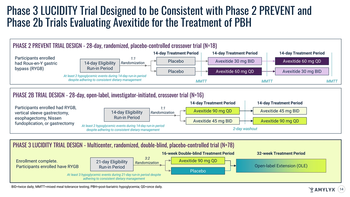 Phase 3 LUCIDITY Trial Designed to be Consistent with Phase 2 PREVENT and Phase 2b Trials Evaluating Avexitide for the Treatment of PBH STUDY DESIGN ELEMENTS PHASE 2 PREVENT PHASE 2B PHASE 3 LUCIDITY RYGB RYGB RYGB Sleeve gastrectomy, Study Population: Surgery Esophagectomy, Nissen fundoplication, Gastrectomy Hypoglycemic events despite Hypoglycemic events despite Hypoglycemic events despite Study Population: dietary management dietary management dietary management Diet Run-In Hypoglycemic At least one per week At least one per week At least one per week Event Rate 30 mg BID/60 mg QD 45 mg BID/90 mg QD 90 mg QD (90 mg QD administered as 2 sequential (90 mg QD administered as 2 sequential Avexitide Dose injections) injections during double blind treatment period and OLE Part A and as 1 injection during OLE Part B) Exploratory: Secondary: Primary: Endpoints Level 2 hypoglycemic events Level 2 hypoglycemic events Composite of Level 2 and Level Level 3 hypoglycemic events Level 3 hypoglycemic events 3 hypoglycemic events 15 BID=twice daily; PBH=post-bariatric hypoglycemia; QD=once daily; RYGB=Roux-en-Y gastric bypass; OLE=open-label extension.