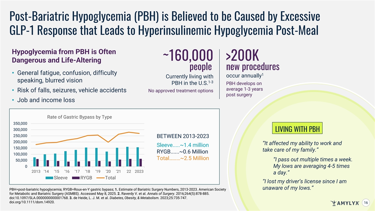 Post-Bariatric Hypoglycemia (PBH) is Believed to be Caused by Excessive GLP-1 Response that Leads to Hyperinsulinemic Hypoglycemia Post-Meal Hypoglycemia from PBH is Often ~160,000 >200K Dangerous and Life-Altering people new procedures • General fatigue, confusion, difficulty 1 occur annually Currently living with speaking, blurred vision 1-3 PBH in the U.S. PBH develops on average 1-3 years • Risk of falls, seizures, vehicle accidents No approved treatment options post surgery • Job and income loss Rate of Gastric Bypass by Type 350,000 300,000 LIVING WITH PBH 250,000 BETWEEN 2013-2023 200,000 “It affected my ability to work and Sleeve.....~1.4 million 150,000 take care of my family.” RYGB......~0.6 Million 100,000 Total………~2.5 Million “I pass out multiple times a week. 50,000 0 My lows are averaging 4-5 times 2013 '14 '15 '16 '17 '18 '19 '20 '21 22 2023 a day.” Sleeve RYGB Total “I lost my driver’s license since I am unaware of my lows.” PBH=post-bariatric hypoglycemia; RYGB=Roux-en-Y gastric bypass; 1. Estimate of Bariatric Surgery Numbers, 2013-2023. American Society for Metabolic and Bariatric Surgery (ASMBS). Accessed May 8, 2025. 2. Raverdy V. et al. Annals of Surgery. 2016;264(5):878-885. doi:10.1097/SLA.0000000000001768. 3. de Heide, L. J. M. et al. Diabetes, Obesity, & Metabolism. 2023;25:735-747. doi.org/10.1111/dom.14920. 16