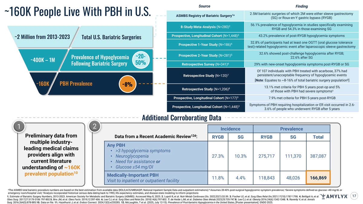 Source Finding 2.5M bariatric surgeries of which 2M were either sleeve gastrectomy ~160K People Live With PBH in U.S. 1a ASMBS Registry of Bariatric Surgery (SG) or Roux-en-Y gastric bypass (RYGB) 56.1% prevalence of hypoglycemia in studies specifically examining 2 8-Study Meta-Analysis (N=280) RYGB and 54.3% in those examining SG 3 Prospective, Longitudinal Cohort (N=1,448) 43.2% prevalence of post-RYGB hypoglycemia symptoms ~2 Million from 2013-2023 Total U.S. Bariatric Surgeries 32.8% of participants had at least one OGTT (oral glucose tolerance 4 Prospective 1-Year Study (N=186) test)-related hypoglycemic event after laparoscopic sleeve gastrectomy 32.6% showed post-challenge hypoglycemia after RYGB; 5 Prospective 2-Year Study (N=281) ~20- 22.6% after SG Prevalence of Hypoglycemia ~400K – 1M 50% 6 Retrospective Survey (N=341) 29% with new-onset hypoglycemia symptoms post-RYGB or SG Following Bariatric Surgery Of 107 individuals with PBH treated with acarbose, 37% had 7 persistent/unacceptable frequency of hypoglycemic events Retrospective Study (N=120) b [Note: Equates to ~8-16% of total bariatric surgery population ] ~160K PBH Prevalence ~8% 13.1% met criteria for PBH 5 years post-op and 5% 8 Retrospective Study (N=1,206) c of those with PBH had severe symptoms 9 Prospective, Longitudinal Cohort (N=177) 7.9% met criteria for PBH 5-years post-RYGB Symptoms of PBH requiring hospitalization or ER visit occurred in 2.6- 3 Prospective, Longitudinal Cohort (N=1,448) 3.6% of people who underwent RYGB after 5 years Additional Corroborating Data 1 2 Incidence Prevalence 12d Preliminary data from Data from a Recent Academic Review : RYGB SG RYGB SG Total multiple industry- Any PBH leading medical claims • >3 hypoglycemia symptoms providers align with • Neuroglycopenia 27.3% 10.3% 275,717 111,370 387,087 current literature • Need for assistance or • Glucose ≤54 mg/Dl understanding of ~160K 10 prevalent population Medically-Important PBH 11.8% 4.4% 118,843 48,026 166,869 Visit to inpatient or outpatient facility a b c The ASMBS total bariatric procedure numbers are based on the best estimation from available data (BOLD,ACS/MBSAQIP, National Inpatient Sample Data and outpatient estimations) Assumes 20-40% post-surgical hypoglycemic symptom prevalence; Severe symptoms defined as glucose <40 mg/dL or d emergency room/hospital visit; Analysis incorporated historical census data dating back to 1993, life expectancy estimates, and disease-state modeling to inform projections 17 1.C Eonf stim id ae te ntial of B. aF ror i iatric nte Su rnal rgeryp N urp um ose bers s,only 2013 . -2023. American Society for Metabolic and Bariatric Surgery (ASMBS). Accessed May 8, 2025. 2. Lupoli R, et al. Nutr Metab Cardiovasc Dis. 2022;32(1):32-39. 3. Fischer LE, et al. Surg Obes Relat Dis.2021;17(10):1787-1798. 4. Belilgoli A, et al. Obes Surg. 2017;27:3179-3186 797-802.5. Brix JM, et al. Obes Facts. 2019;12:397-406. 6. Lee CJ, et al. Surg Obes and Relat Dis. 2018;14(6):797-802. 7. de Heide LJM, et al. Diabetes Obes Metab.2023;25:735-747.8. Lee CJ, et al. Obesity.2016.24(6):1342-1348. 9. Raverdy V, et al. Annals Surg. 2016.264(5):878-885.10. Data on file. 11. Hazelhurst J, et al. Endocr Connect. 2024;13(5):e230285. 12. McLaughlin, T et al. (2025, July 12-15). Prevalence of Post-bariatric Hypoglycemia in the United States, [Poster presentation]. ENDO 2025.