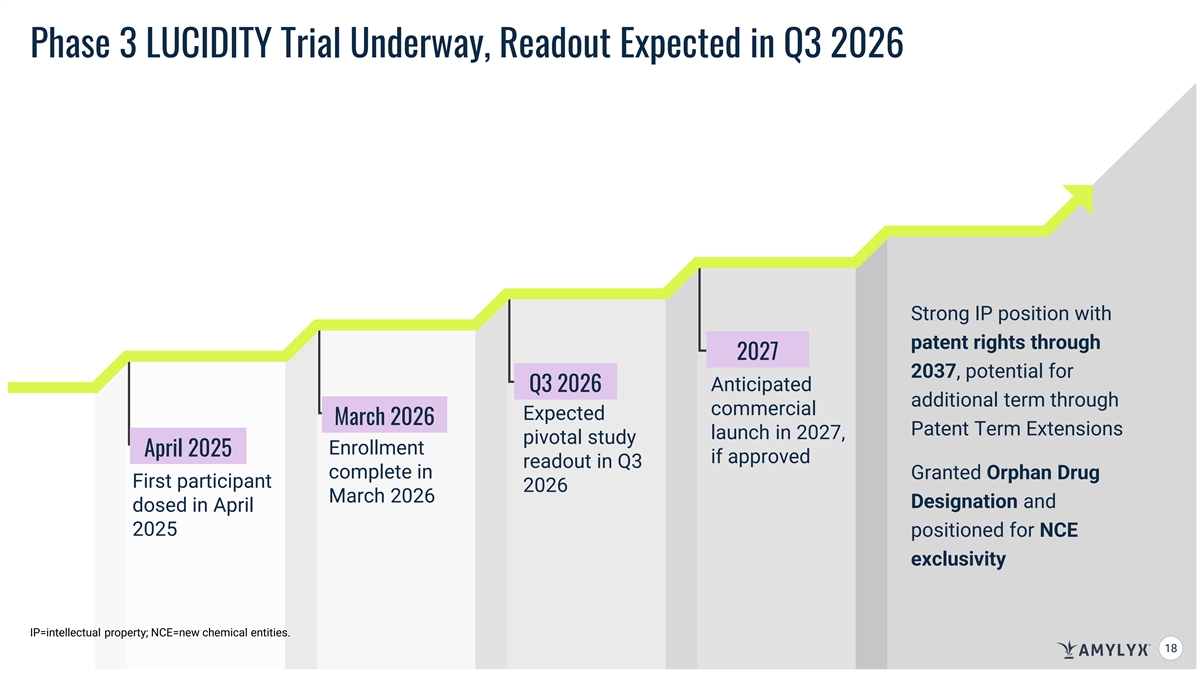Phase 3 LUCIDITY Trial Underway, Readout Expected in Q3 2026 Strong IP position with patent rights through 2027 2037, potential for Anticipated Q3 2026 additional term through commercial Expected March 2026 Patent Term Extensions launch in 2027, pivotal study Enrollment April 2025 if approved readout in Q3 complete in Granted Orphan Drug First participant 2026 March 2026 Designation and dosed in April 2025 positioned for NCE exclusivity IP=intellectual property; NCE=new chemical entities. 18 18