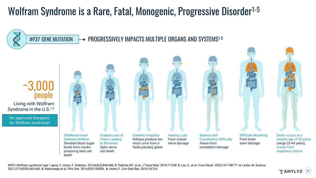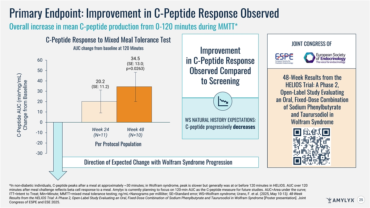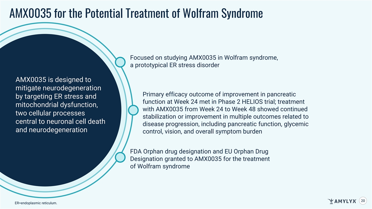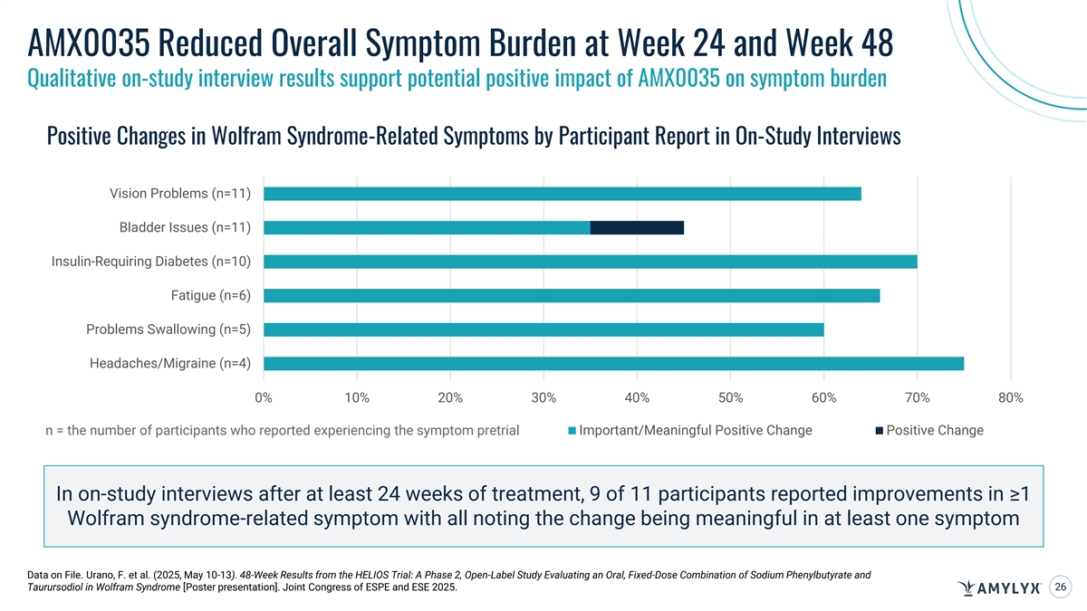 Long-Term Data Suggest Potential Benefit of AMX0035 in Wolfram Syndrome Across Multiple Outcomes Related to Disease Progression Expected Progression of Wolfram Syndrome Trend Baseline to Week 24 Trend Baseline to Week 48 Partial Reversal in Partial Reversal in Progressive Decline C-Peptide Response AUC C-Peptide Phenotype C-Peptide Phenotype Increase in Beta Cell Increase in Beta Cell 1 Progressive Decline ∆ C-Peptide Responsiveness Responsiveness Diabetic Measures Progressively More Improved Glycemic Improved Glycemic HbA1c 2 Difficult to Maintain Control Control Time in Target Glucose Range Progressively More Improved Glycemic Improved Glycemic Difficult to Maintain Control Control (70-180 mg/dL) Improved or Stable Improved or Stable 3 Visual Measure Progressive Decline Visual Acuity Acuity Acuity Participant and Clinician Participant and Clinician Symptom Burden Progressive Decline Reported Improvement or Reported Improvement or CGI-C and PGI-C Stabilization Stabilization Safety Profile was Consistent with Safety Profile was Consistent with 4 4 Prior Safety Data Prior Safety Data AUC=area under the curve; CGI-C=clinician-reported global impression of change ; HbA1c=glycated hemoglobin A1c; PGI-C=patient-reported global impression of change; Urano, F. et al. (2025, May 10-13). 48-Week Results from the HELIOS Trial: A Phase 2, Open-Label Study Evaluating an Oral, Fixed-Dose Combination of Sodium Phenylbutyrate and Taurursodiol in Wolfram Syndrome [Poster presentation]. Joint Congress of ESPE and ESE 2025. 1. Recent natural history study demonstrated C-peptide levels progressively decline in people with Wolfram syndrome. 2. Recent natural history study demonstrated that average HbA1c increases and time in target glucose range declines in people with Wolfram syndrome. 3. Recent natural history study demonstrated visual acuity progressively worsens in people with Wolfram syndrome. 4. AMX0035 24 was generally well-tolerated. All adverse events (AEs) were mild or moderate, and there were no serious AEs related to AMX0035 treatment.