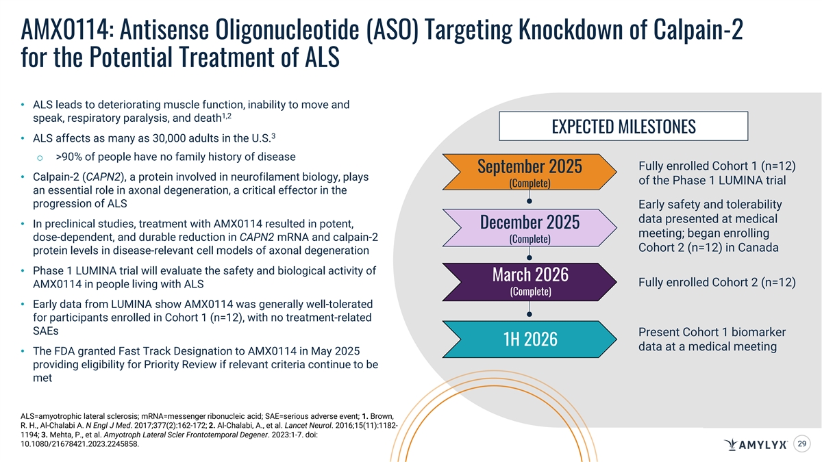 AMX0114: Antisense Oligonucleotide (ASO) Targeting Knockdown of Calpain-2 for the Potential Treatment of ALS • ALS leads to deteriorating muscle function, inability to move and 1,2 speak, respiratory paralysis, and death EXPECTED MILESTONES 3 • ALS affects as many as 30,000 adults in the U.S. o >90% of people have no family history of disease Fully enrolled Cohort 1 (n=12) September 2025 • Calpain-2 (CAPN2), a protein involved in neurofilament biology, plays of the Phase 1 LUMINA trial (Complete) an essential role in axonal degeneration, a critical effector in the progression of ALS Early safety and tolerability data presented at medical • In preclinical studies, treatment with AMX0114 resulted in potent, December 2025 meeting; began enrolling dose-dependent, and durable reduction in CAPN2 mRNA and calpain-2 (Complete) Cohort 2 (n=12) in Canada protein levels in disease-relevant cell models of axonal degeneration • Phase 1 LUMINA trial will evaluate the safety and biological activity of March 2026 Fully enrolled Cohort 2 (n=12) AMX0114 in people living with ALS (Complete) • Early data from LUMINA show AMX0114 was generally well-tolerated for participants enrolled in Cohort 1 (n=12), with no treatment-related SAEs Present Cohort 1 biomarker 1H 2026 data at a medical meeting • The FDA granted Fast Track Designation to AMX0114 in May 2025 providing eligibility for Priority Review if relevant criteria continue to be met ALS=amyotrophic lateral sclerosis; mRNA=messenger ribonucleic acid; SAE=serious adverse event; 1. Brown, R. H., Al-Chalabi A. N Engl J Med. 2017;377(2):162-172; 2. Al-Chalabi, A., et al. Lancet Neurol. 2016;15(11):1182- 1194; 3. Mehta, P., et al. Amyotroph Lateral Scler Frontotemporal Degener. 2023:1-7. doi: 10.1080/21678421.2023.2245858. 29