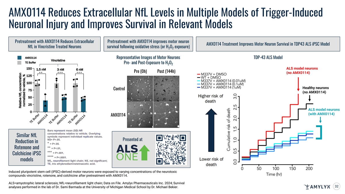 AMX0114 Reduces Extracellular NfL Levels in Multiple Models of Trigger-Induced Neuronal Injury and Improves Survival in Relevant Models Pretreatment with AMX0114 Reduces Extracellular Pretreatment with AMX0114 improves motor neuron AMX0114 Treatment Improves Motor Neuron Survival in TDP43 ALS iPSC Model NfL in Vincristine Treated Neurons survival following oxidative stress (or H O exposure) 2 2 Representative Images of Motor Neurons TDP-43 ALS Model Pre- and Post-Exposure to H O 2 2 ALS model neurons Pre (0h) Post (144h) (no AMX0114) Healthy neurons Control (no AMX0114) ALS model neurons (with AMX0114) AMX0114 Bars represent mean (SD) Nfl concentrations relative to vehicle. Overlying Similar NfL symbols represent individuaI repIicate values. NS= P>.05. Presented at Reduction in * = P<.05. Rotenone and ** = P<.01, *** = P<.001, Colchicine iPSC **** = P<.0001. models NfL, neurofilament light chain; NS, not significant; TE, tris ethylenediaminetetraacetic acid. Induced pluripotent stem cell (iPSC)-derived motor neurons were exposed to varying concentrations of the neurotoxic compounds vincristine, rotenone, and colchicine after pretreatment with AMX0114. ALS=amyotrophic lateral sclerosis; NfL=neurofilament light chain; Data on File. Amylyx Pharmaceuticals Inc. 2024; Survival 32 analyses performed in the lab of Dr. Sami Barmada at the University of Michigan Medical School by Dr. Michael Bekier.