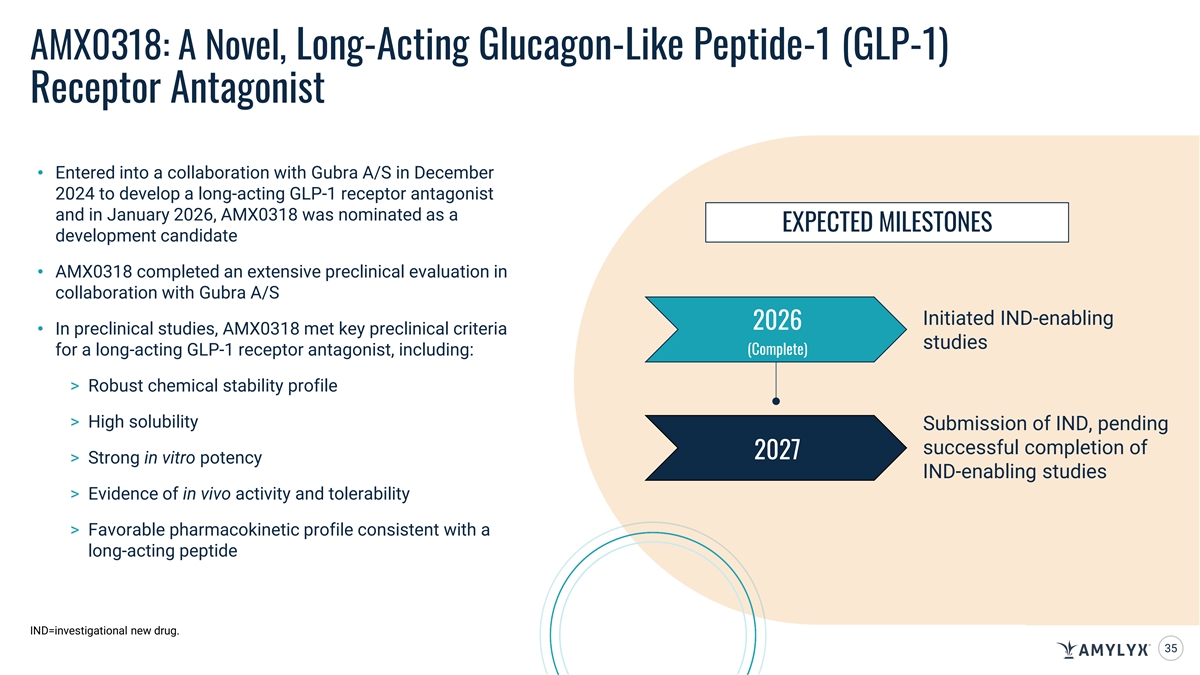 AMX0318: A Novel, Long-Acting Glucagon-Like Peptide-1 (GLP-1) Receptor Antagonist • Entered into a collaboration with Gubra A/S in December 2024 to develop a long-acting GLP-1 receptor antagonist and in January 2026, AMX0318 was nominated as a EXPECTED MILESTONES development candidate • AMX0318 completed an extensive preclinical evaluation in collaboration with Gubra A/S Initiated IND-enabling 2026 • In preclinical studies, AMX0318 met key preclinical criteria studies (Complete) for a long-acting GLP-1 receptor antagonist, including: > Robust chemical stability profile > High solubility Submission of IND, pending successful completion of 2027 > Strong in vitro potency IND-enabling studies > Evidence of in vivo activity and tolerability > Favorable pharmacokinetic profile consistent with a long-acting peptide IND=investigational new drug. 35