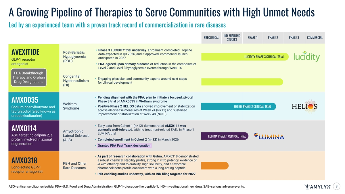 DISCLAIMER Statements contained in this presentation regarding matters that are not historical facts are “forward-looking statements” within the meaning of the Private Securities Litigation Reform Act of 1995, as amended. Because such statements are subject to risks and uncertainties, actual results may differ materially from those expressed or implied by such forward-looking statements. Such statements include, but are not limited to, the Company’s plans to explore the use of avexitide as a treatment for post-bariatric hypoglycemia (PBH) and congenital hyperinsulinism, AMX0035 for Wolfram syndrome, AMX0114 for ALS, and AMX0318 for PBH and other rare diseases; statements regarding the timing of clinical trials for PBH, Wolfram syndrome and/or ALS; expectation for regulatory action; and expectations regarding our longer-term strategy and expected cash runway. Any forward-looking statements in this presentation are based on management’s current expectations of future events and are subject to a number of risks and uncertainties that could cause actual results to differ materially and adversely from those set forth in or implied by such forward- looking statements. Risks that contribute to the uncertain nature of the forward-looking statements include: the success, cost, and timing of Amylyx’s program development activities, including ongoing and planned clinical trials, Amylyx’s ability to execute on its development and regulatory strategy, regulatory developments, Amylyx’s cash runway and ability to fund operations, as well as the risks and uncertainties set forth in Amylyx’s United States Securities and Exchange Commission (SEC) filings, including Amylyx’s Annual Report on Form 10-K for the year ended December 31, 2025, and subsequent filings with the SEC. All forward-looking statements contained in this presentation speak only as of the date on which they were made. Amylyx undertakes no obligation to update such statements to reflect events that occur or circumstances that exist after the date on which they were made. 2