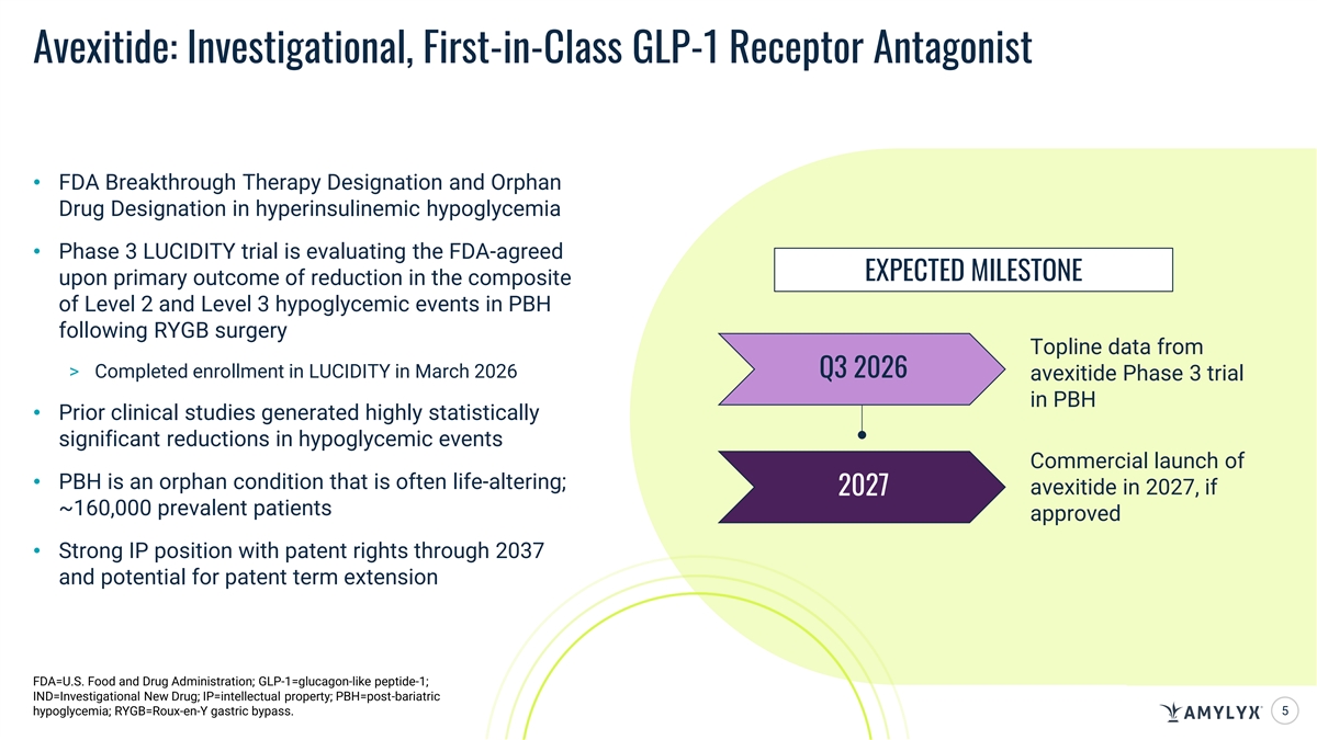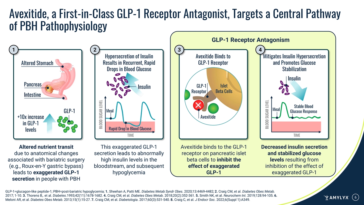 Avexitide: Investigational, First-in-Class GLP-1 Receptor Antagonist • FDA Breakthrough Therapy Designation and Orphan Drug Designation in hyperinsulinemic hypoglycemia • Phase 3 LUCIDITY trial is evaluating the FDA-agreed EXPECTED MILESTONE upon primary outcome of reduction in the composite of Level 2 and Level 3 hypoglycemic events in PBH following RYGB surgery Topline data from > Completed enrollment in LUCIDITY in March 2026 Q3 2026 avexitide Phase 3 trial in PBH • Prior clinical studies generated highly statistically significant reductions in hypoglycemic events Commercial launch of • PBH is an orphan condition that is often life-altering; avexitide in 2027, if 2027 ~160,000 prevalent patients approved • Strong IP position with patent rights through 2037 and potential for patent term extension FDA=U.S. Food and Drug Administration; GLP-1=glucagon-like peptide-1; IND=Investigational New Drug; IP=intellectual property; PBH=post-bariatric hypoglycemia; RYGB=Roux-en-Y gastric bypass. 5