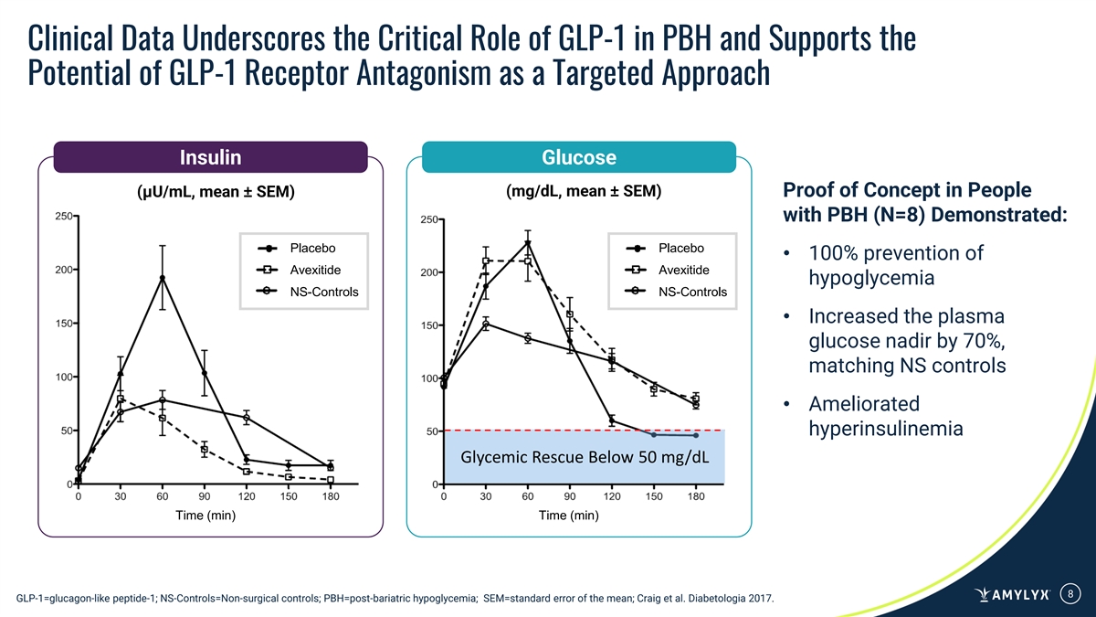 Targeted Approach to Inhibit Effects of Excessive GLP-1 in PBH to Mitigate Hypoglycemia GLP-1 levels observed to be more than 10-fold Avexitide inhibits GLP-1 receptor activity and higher in PBH than in Nonsurgical Controls, decreases the insulin response to glucose in rat resulting in dysregulated secretion of insulin and 1,2, 3 pancreatic islet cells subsequent hypoglycemia 300 4 Gastric Bypass + PBH (GB + PBH) 16.7 G +/- GLP-1 +/- Avexitide Gastric Bypass (GB) Overweight (OW) Morbidly Overweight (Mob) 200 Glucose Glucose + GLP-1 Glucose + GLP-1 + Avexitide 100 Glucose + GLP-1 + Avexitide 0 0 20 40 60 80 100 120 Time (min) Time (min) GLP-1=glucagon-like peptide-1; GSIS=glucose-stimulated insulin secretion; PBH=post-bariatric hypoglycemia; 1. Goldfine A. B. et al. J Clin Endocrinol Metab. 2007; 92(12):4678–4685. doi.org/10.1210/jc.2007- 0918. 2. Cabrera O. et al. The Journal of Biological Chemistry. 2022;298(2):101484. doi:10.1016/j.jbc.2021.101484; 3. Averaged data from five independent experiments; 4. Step-wise increase of glucose concentration from 2.8 to 16.7 mM (2.8G and 16.7G). 7 GLP-1 (pmol/L) Insulin (ng) / DNA (µg)