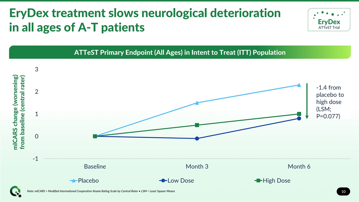 EryDex efficacy and safety profile EryDex ATTeST Trial demonstrated in prior clinical trial Completed largest global study of A-T patients in Phase 3 ATTeST clinical trial and OLE • Double-blind, placebo-controlled study (N=175) over 6-month treatment period with 12-month OLE (N=104) • Patients randomized 1:1:1 to EryDex low dose, high dose, or placebo • Primary endpoint: mICARS – Secondary endpoints: CGI-C • QOL • VABS EryDex slowed neurological deterioration in all ages of A-T patients with statistically significant effect in 6 to 9 year subgroup 12-month safety analysis demonstrated EryDex well-tolerated with no major adverse events typically associated with chronic steroid administration Pursuing regulatory activities related to partial clinical hold in U.S. related to EryKit treatment consumables, in addition to activities to support potential MAA submission of EryDex • CE mark already obtained in Europe for treatment device and consumables kit 9 Note: mICARS = Modified International Cooperative Ataxia Rating Scale • CGI-C = Clinical Global Impression – Change • QOL = Quality of Life • VABS = Vineland Adaptive Behavior Scales 9 9