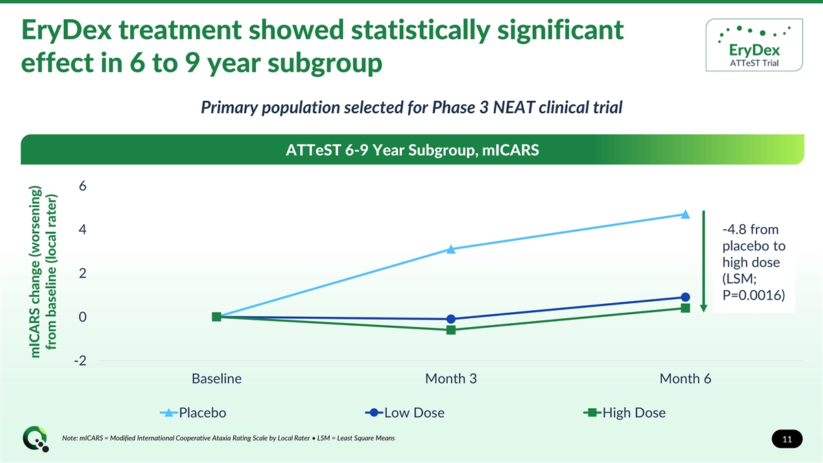 EryDex treatment slows neurological deterioration EryDex ATTeST Trial in all ages of A-T patients ATTeST Primary Endpoint (All Ages) in Intent to Treat (ITT) Population 3 -1.4 from 2 placebo to high dose (LSM; 1 P=0.077) 0 -1 Baseline Month 3 Month 6 Placebo Low Dose High Dose Note: mICARS = Modified International Cooperative Ataxia Rating Scale by Central Rater • LSM = Least Square Means 10 mICARS change (worsening) from baseline (central rater)