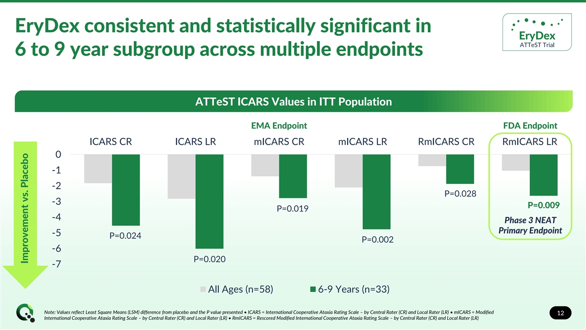 EryDex treatment showed statistically significant EryDex ATTeST Trial effect in 6 to 9 year subgroup Primary population selected for Phase 3 NEAT clinical trial ATTeST 6-9 Year Subgroup, mICARS 6 4 -4.8 from placebo to high dose 2 (LSM; P=0.0016) 0 -2 Baseline Month 3 Month 6 Placebo Low Dose High Dose Note: mICARS = Modified International Cooperative Ataxia Rating Scale by Local Rater • LSM = Least Square Means 11 mICARS change (worsening) from baseline (local rater)