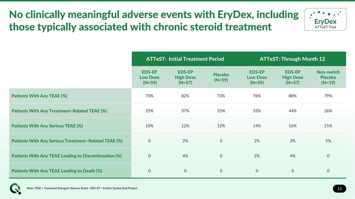 No clinically meaningful adverse events with EryDex, including EryDex ATTeST Trial those typically associated with chronic steroid treatment ATTeST: Initial Treatment Period ATTeST: Through Month 12 EDS-EP EDS-EP EDS-EP EDS-EP Non-switch Placebo Low Dose High Dose Low Dose High Dose Placebo (N=59) (N=59) (N=57) (N=59) (N=57) (N=19) 73% 82% 73% 76% 88% 79% Patients With Any TEAE (%) Patients With Any Treatment–Related TEAE (%) 25% 37% 25% 32% 44% 26% 10% 12% 12% 14% 16% 21% Patients With Any Serious TEAE (%) 0 2% 0 2% 2% 5% Patients With Any Serious Treatment–Related TEAE (%) Patients With Any TEAE Leading to Discontinuation (%) 0 4% 0 2% 4% 0 0 0 0 0 0 0 Patients With Any TEAE Leading to Death (%) Note: TEAE = Treatment Emergent Adverse Event • EDS-EP = EryDex System End Product 13