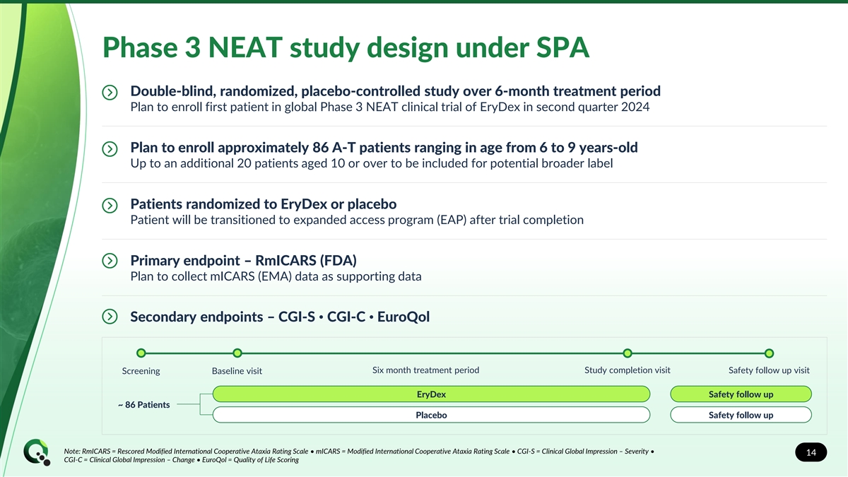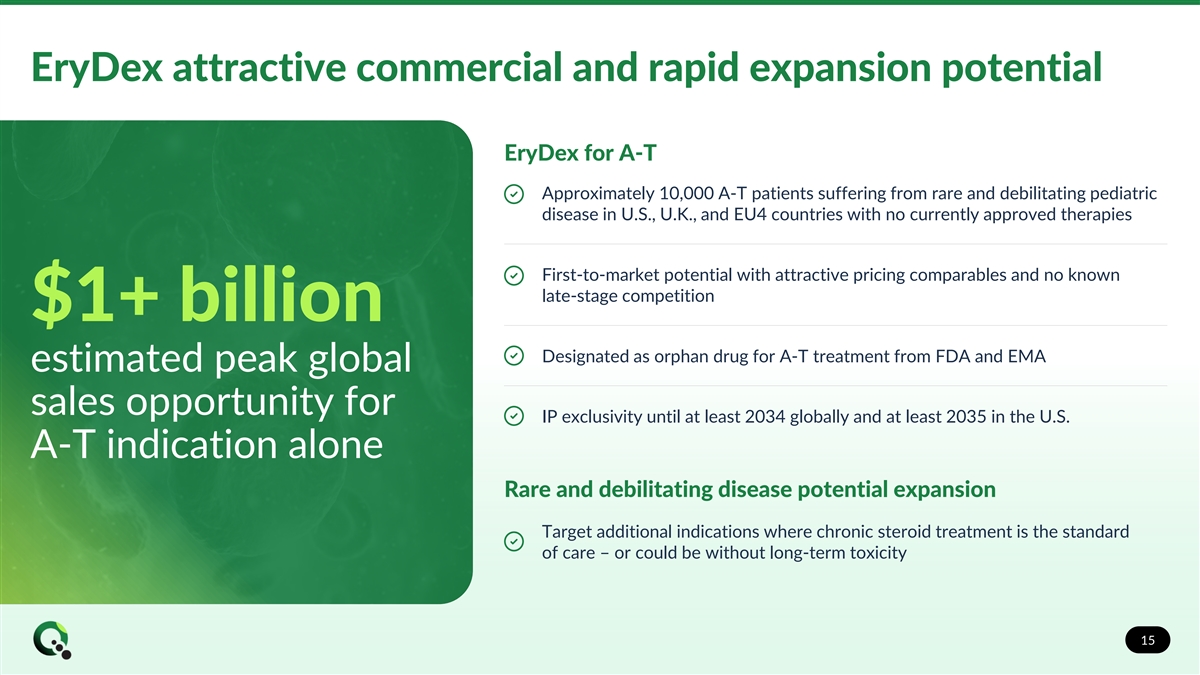 Phase 3 NEAT study design under SPA Double-blind, randomized, placebo-controlled study over 6-month treatment period Plan to enroll first patient in global Phase 3 NEAT clinical trial of EryDex in second quarter 2024 Plan to enroll approximately 86 A-T patients ranging in age from 6 to 9 years-old Up to an additional 20 patients aged 10 or over to be included for potential broader label Patients randomized to EryDex or placebo Patient will be transitioned to expanded access program (EAP) after trial completion Primary endpoint – RmICARS (FDA) Plan to collect mICARS (EMA) data as supporting data Secondary endpoints – CGI-S • CGI-C • EuroQol Six month treatment period Study completion visit Safety follow up visit Screening Baseline visit EryDex Safety follow up ~ 86 Patients Placebo Safety follow up Note: RmICARS = Rescored Modified International Cooperative Ataxia Rating Scale • mICARS = Modified International Cooperative Ataxia Rating Scale • CGI-S = Clinical Global Impression – Severity • 14 CGI-C = Clinical Global Impression – Change • EuroQol = Quality of Life Scoring