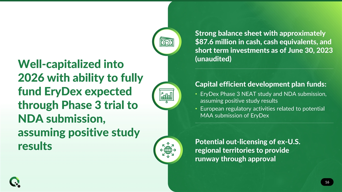 EryDex attractive commercial and rapid expansion potential EryDex for A-T Approximately 10,000 A-T patients suffering from rare and debilitating pediatric disease in U.S., U.K., and EU4 countries with no currently approved therapies First-to-market potential with attractive pricing comparables and no known late-stage competition $1+ billion Designated as orphan drug for A-T treatment from FDA and EMA estimated peak global sales opportunity for IP exclusivity until at least 2034 globally and at least 2035 in the U.S. A-T indication alone Rare and debilitating disease potential expansion Target additional indications where chronic steroid treatment is the standard of care – or could be without long-term toxicity 15