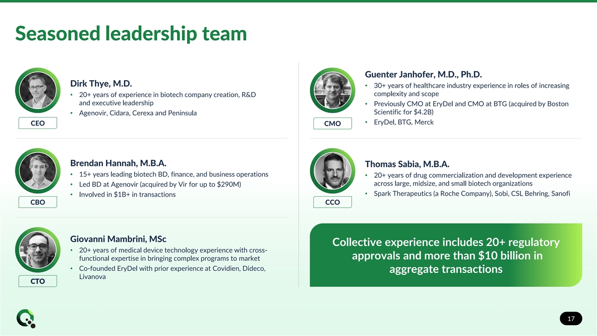 Strong balance sheet with approximately $87.6 million in cash, cash equivalents, and short term investments as of June 30, 2023 (unaudited) Well-capitalized into 2026 with ability to fully Capital efficient development plan funds: fund EryDex expected • EryDex Phase 3 NEAT study and NDA submission, assuming positive study results through Phase 3 trial to • European regulatory activities related to potential MAA submission of EryDex NDA submission, assuming positive study Potential out-licensing of ex-U.S. results regional territories to provide runway through approval 16 16